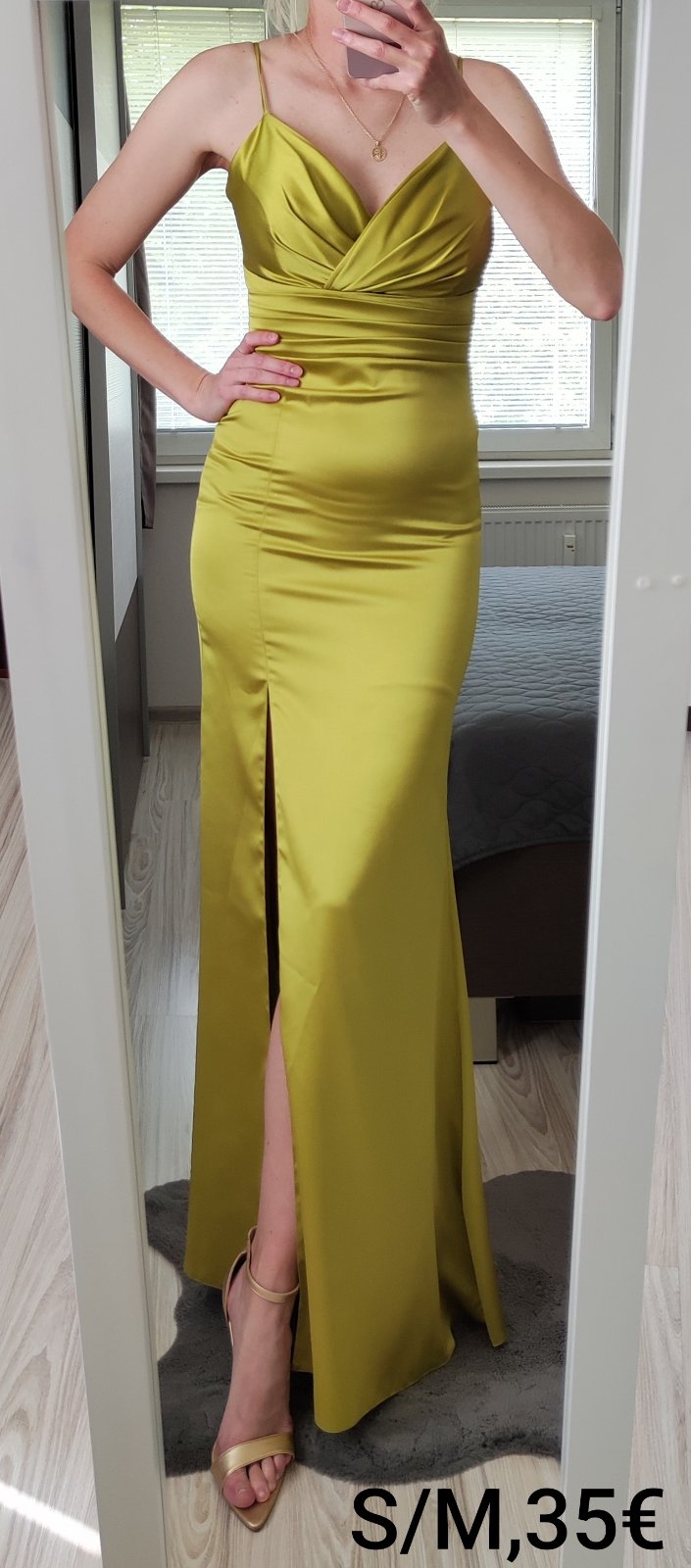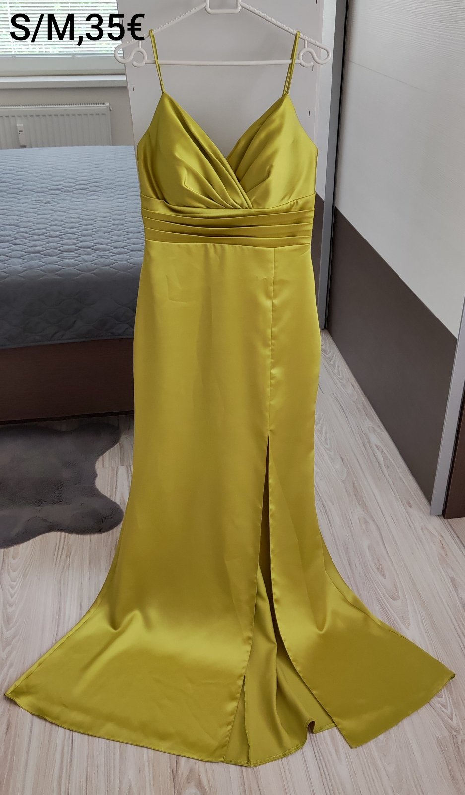 Dlhé žlté saténové večerné šaty. Cez jedno rameno s odhaleným chrbtom. Od sukni sú rozstrihnuté, oblečené 2-krát. Veľkosť 36/38 - rozmery cca: prsia-88cm, pás-70cm, boky-96. Cena: 20€ plus poštovné...
