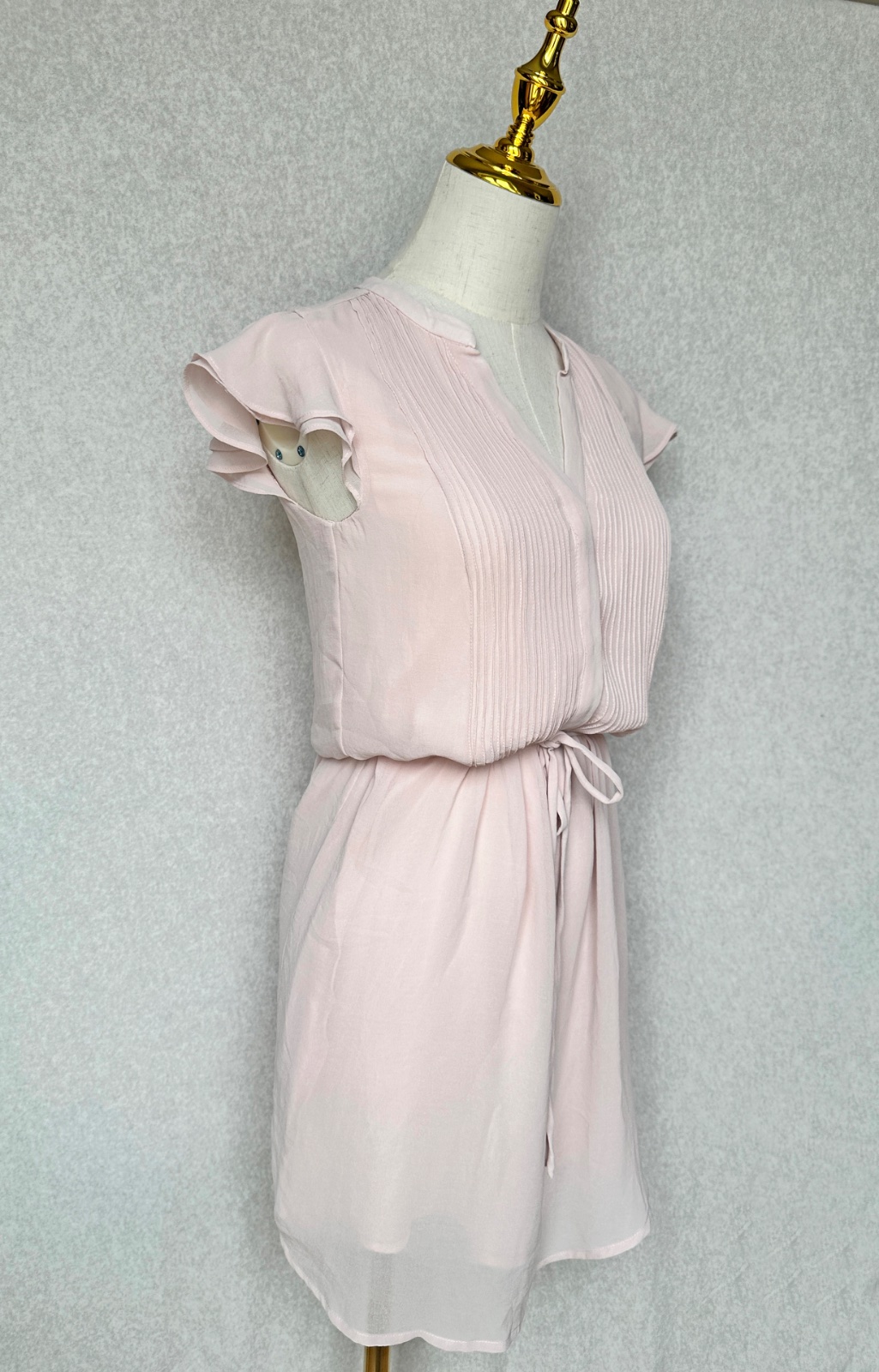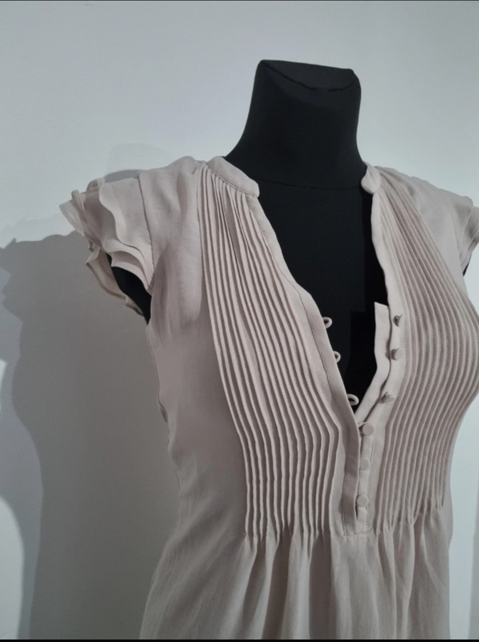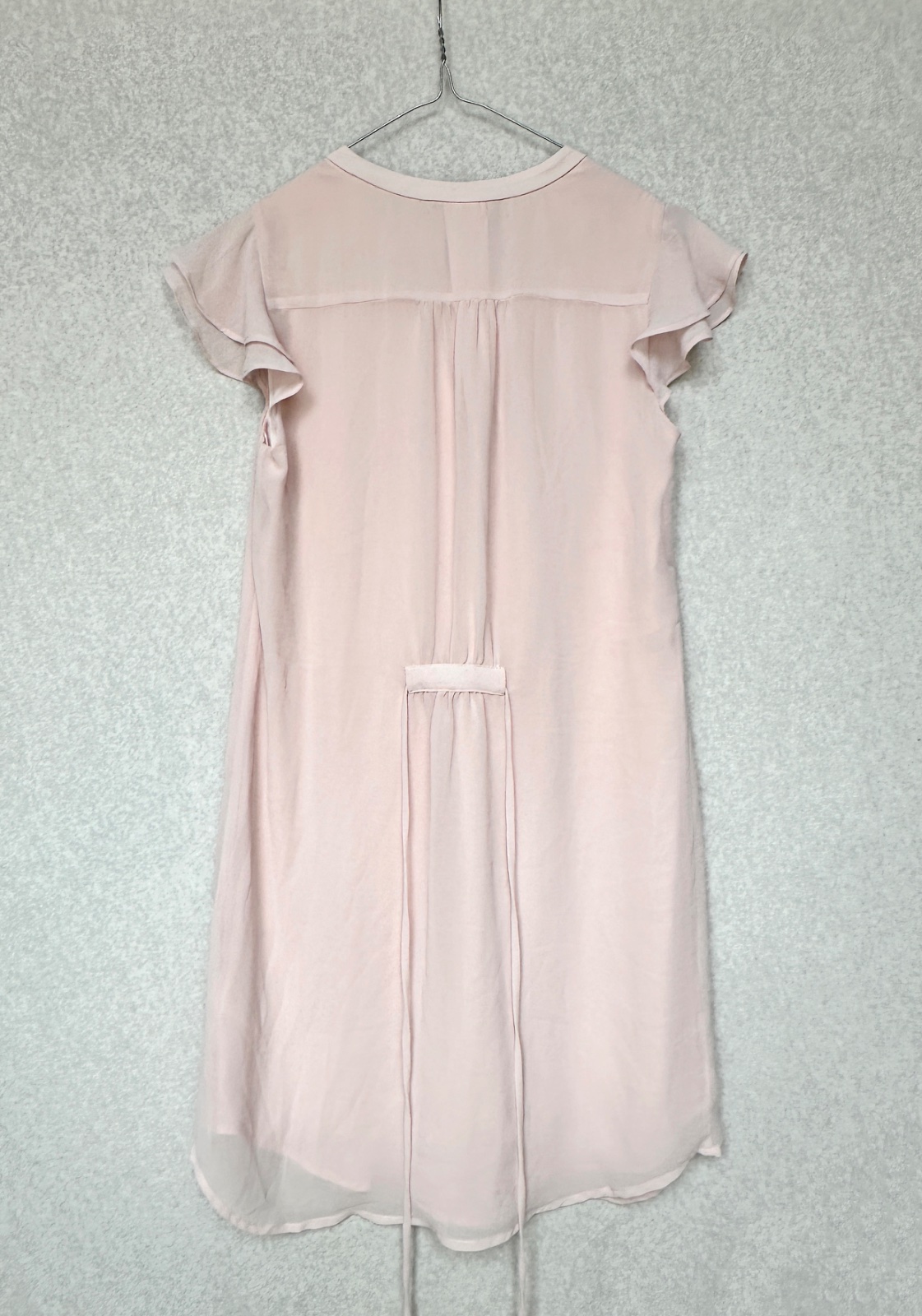 Šaty z jemnej polopriesvitnej látky v bledúčko ružovej farbe. Sú podšité - nepresvitajú. V páse je opasok. V super stave, bez poškodení, bez známok použitia.