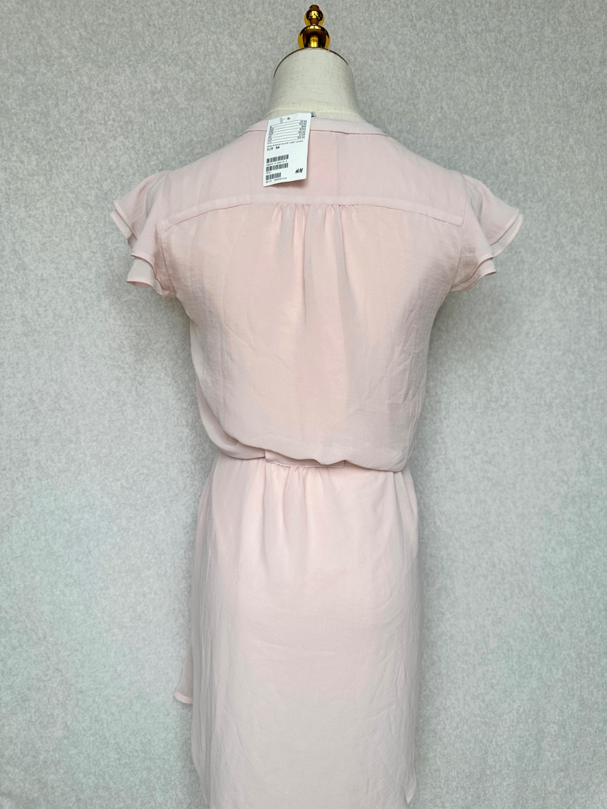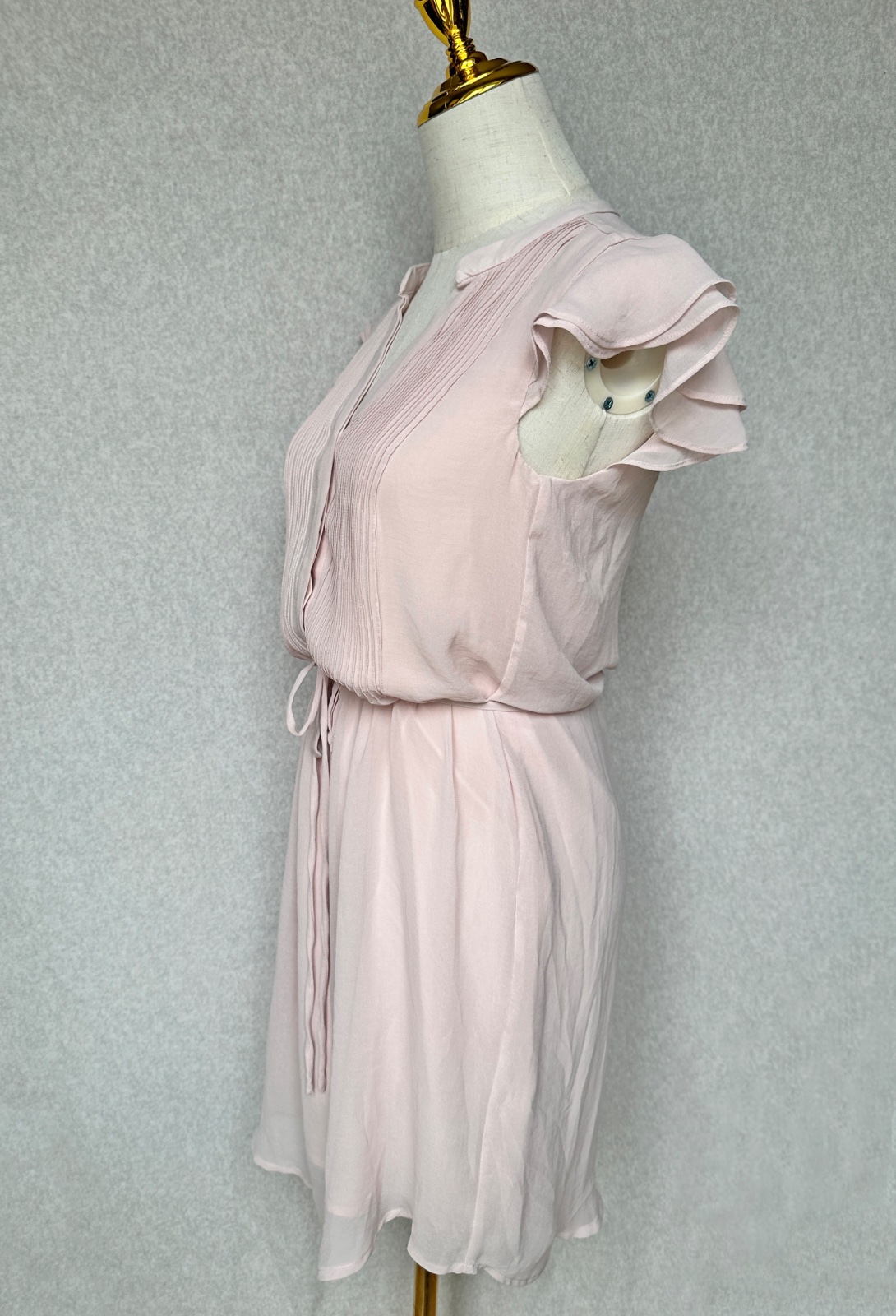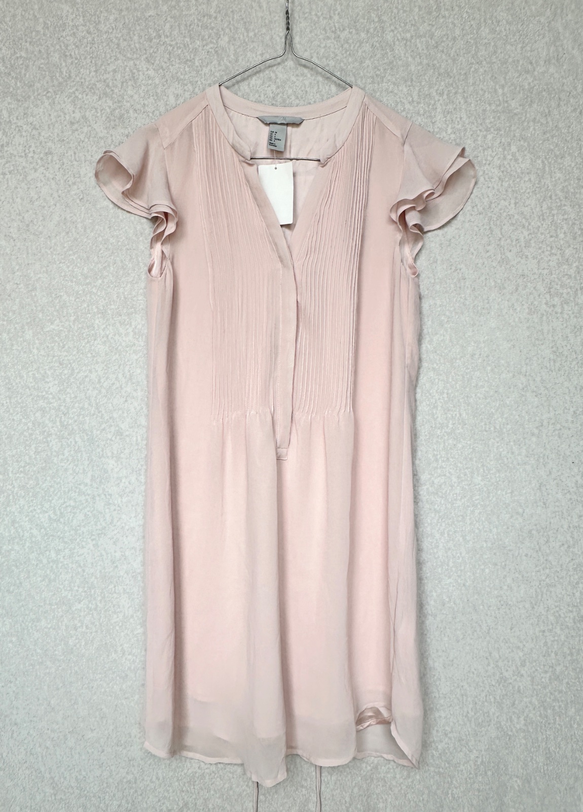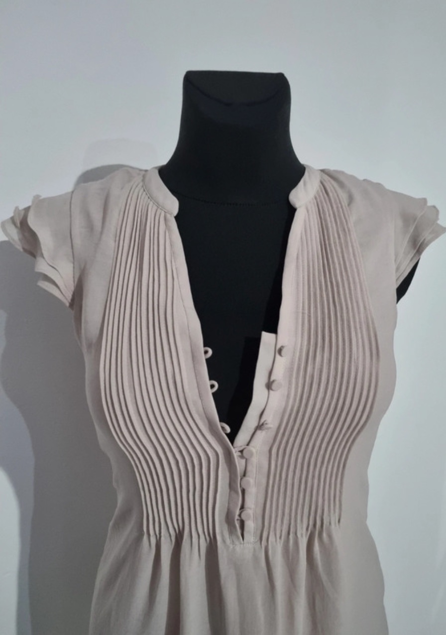 Šaty z jemnej polopriesvitnej látky v bledúčko ružovej farbe. Sú podšité - nepresvitajú. V páse je opasok. V super stave, bez poškodení, bez známok použitia.