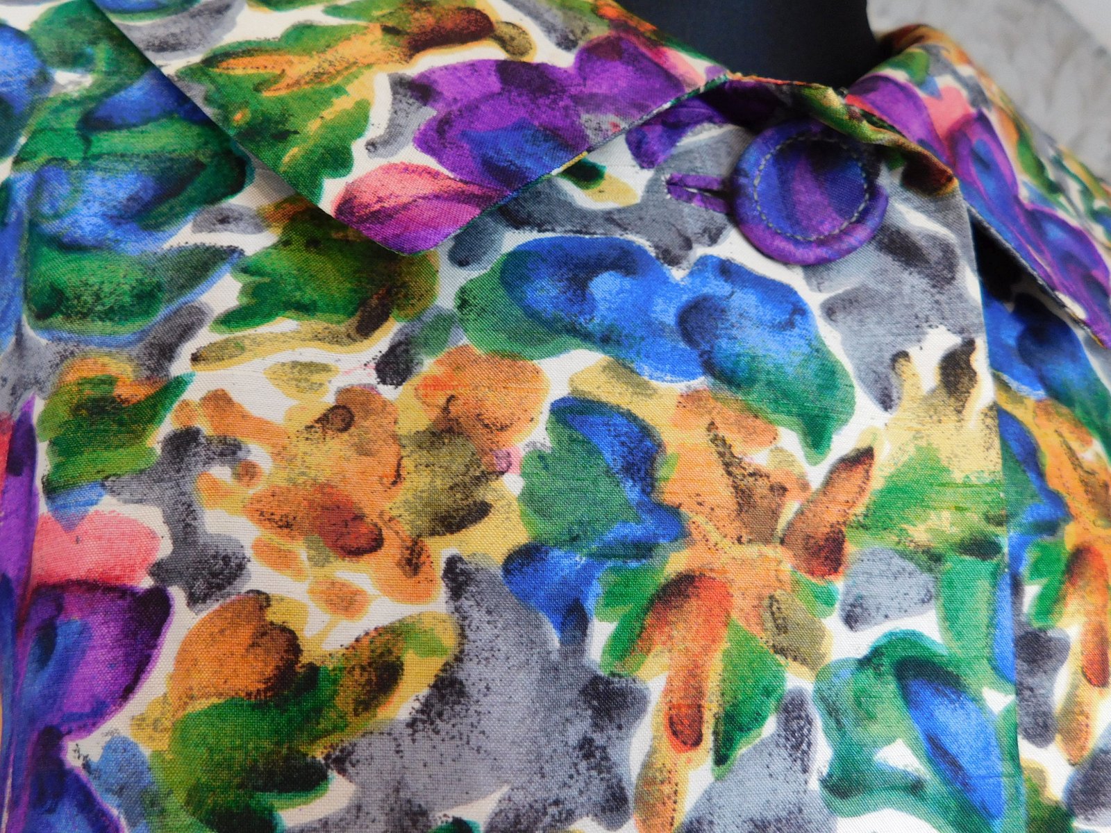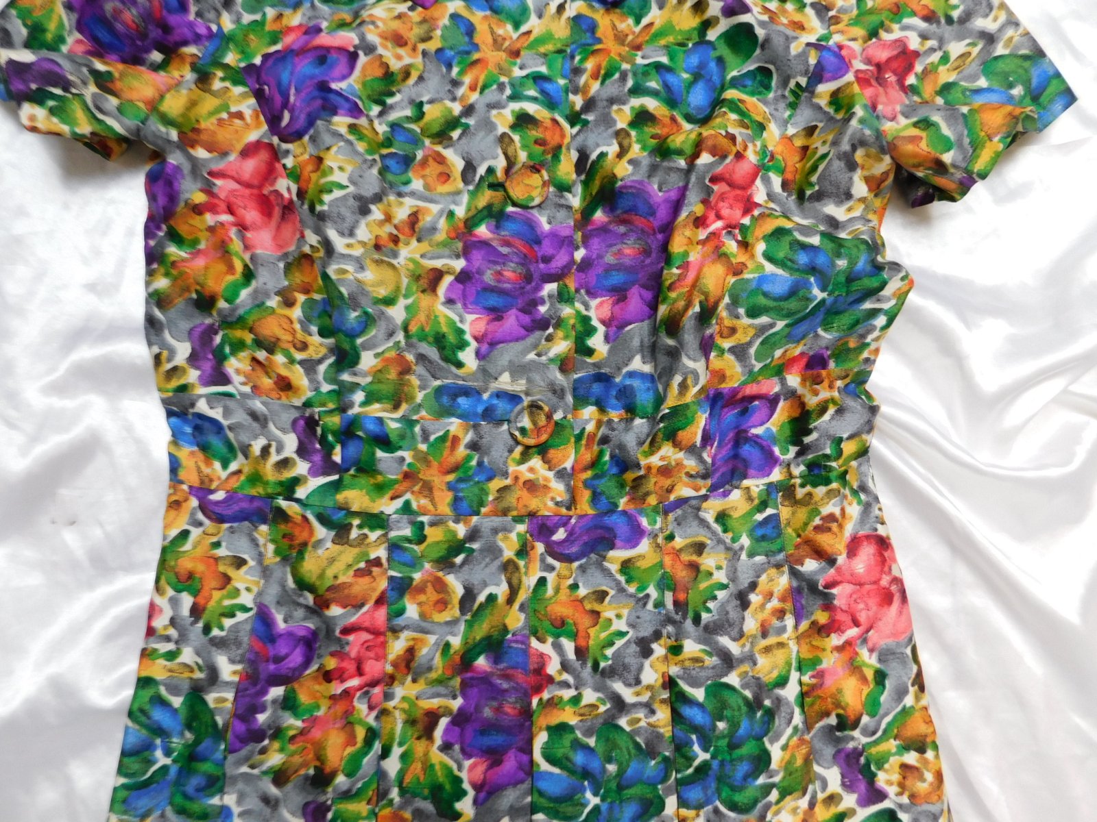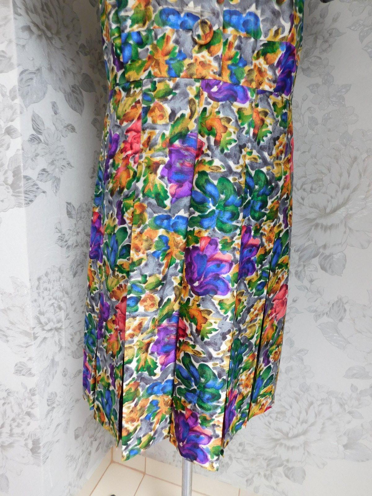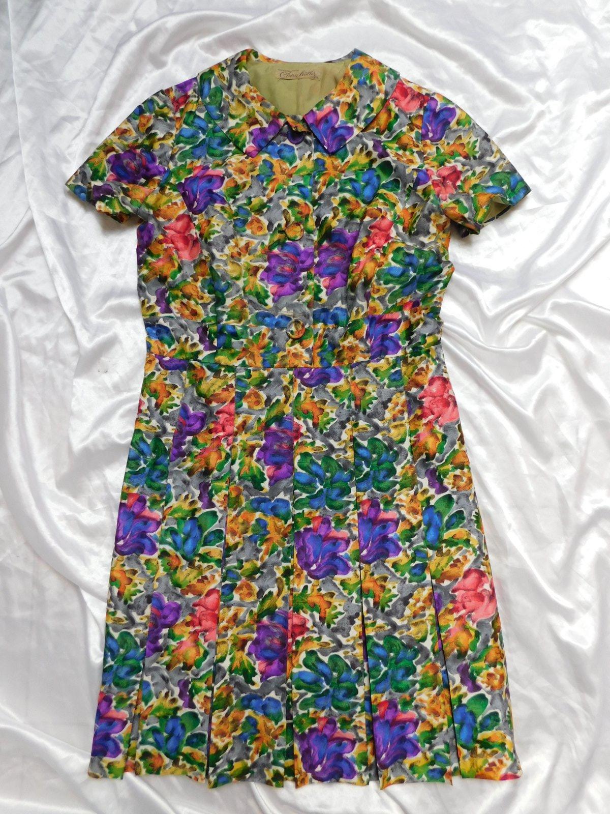Luxusne velmi pekne vintage šaty,s potlačou,vpredu gombikova lega,vzadu od pasu kratky zips,na spodku zahnute 8cm.treba počistit,inak super stav.se1