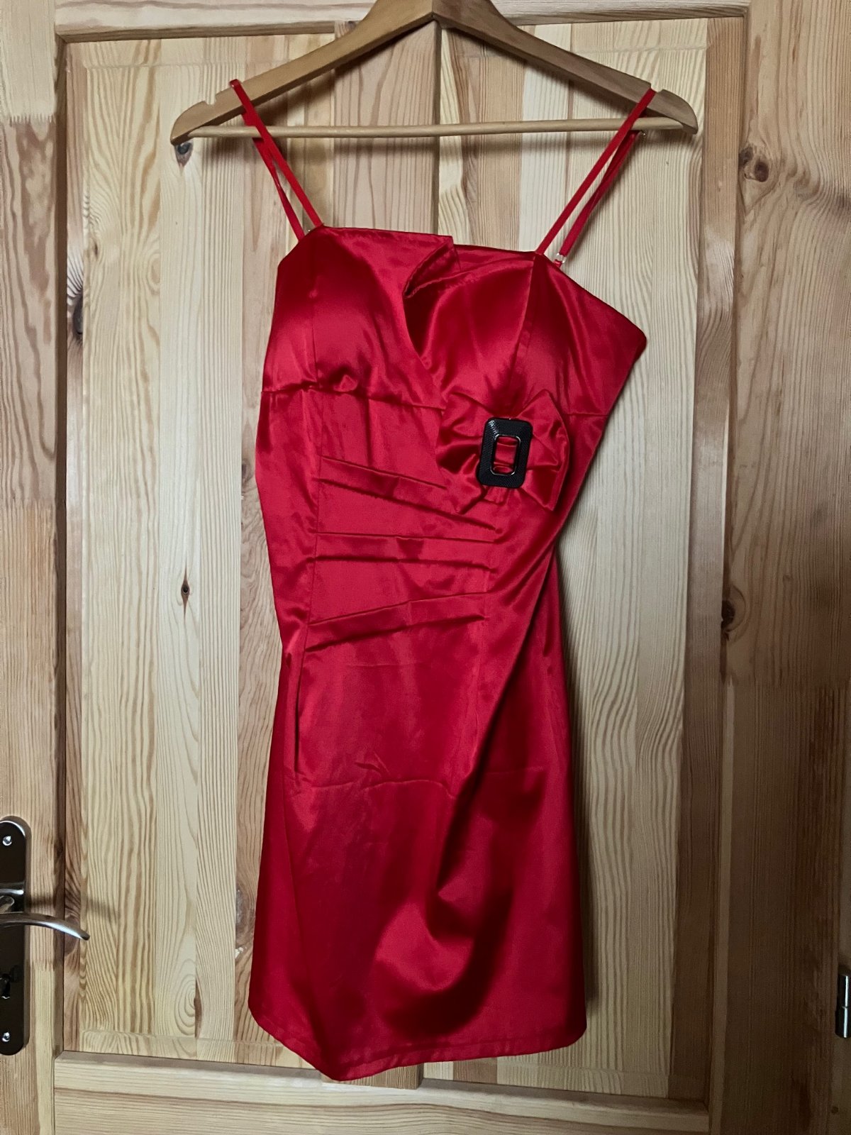Príjemné saténové krátke šaty, zaujímavý detail zahnutia na hrudi, mašľa s lesklou prackou, veľmi príjemné na telo. Ramienka nastaviteľné. Na 160 cm dievča/ženu dĺžka nad kolená čiže skôr na nižšiu postavu. Cena bez poštovného, v Košiciach možný osobný odber.