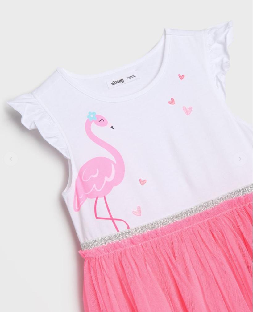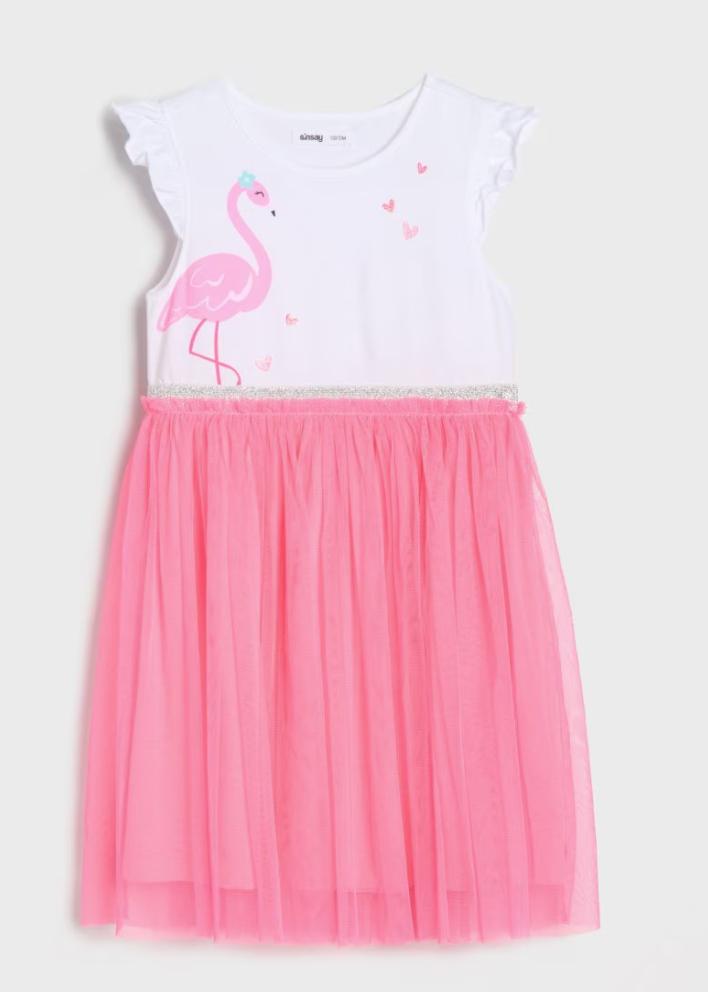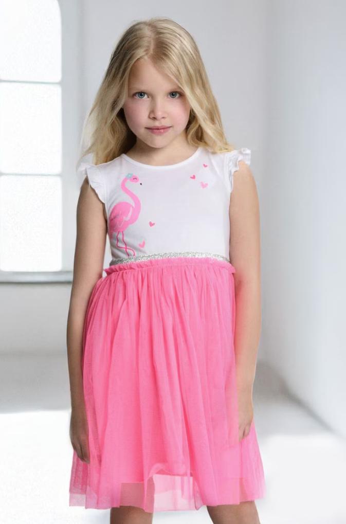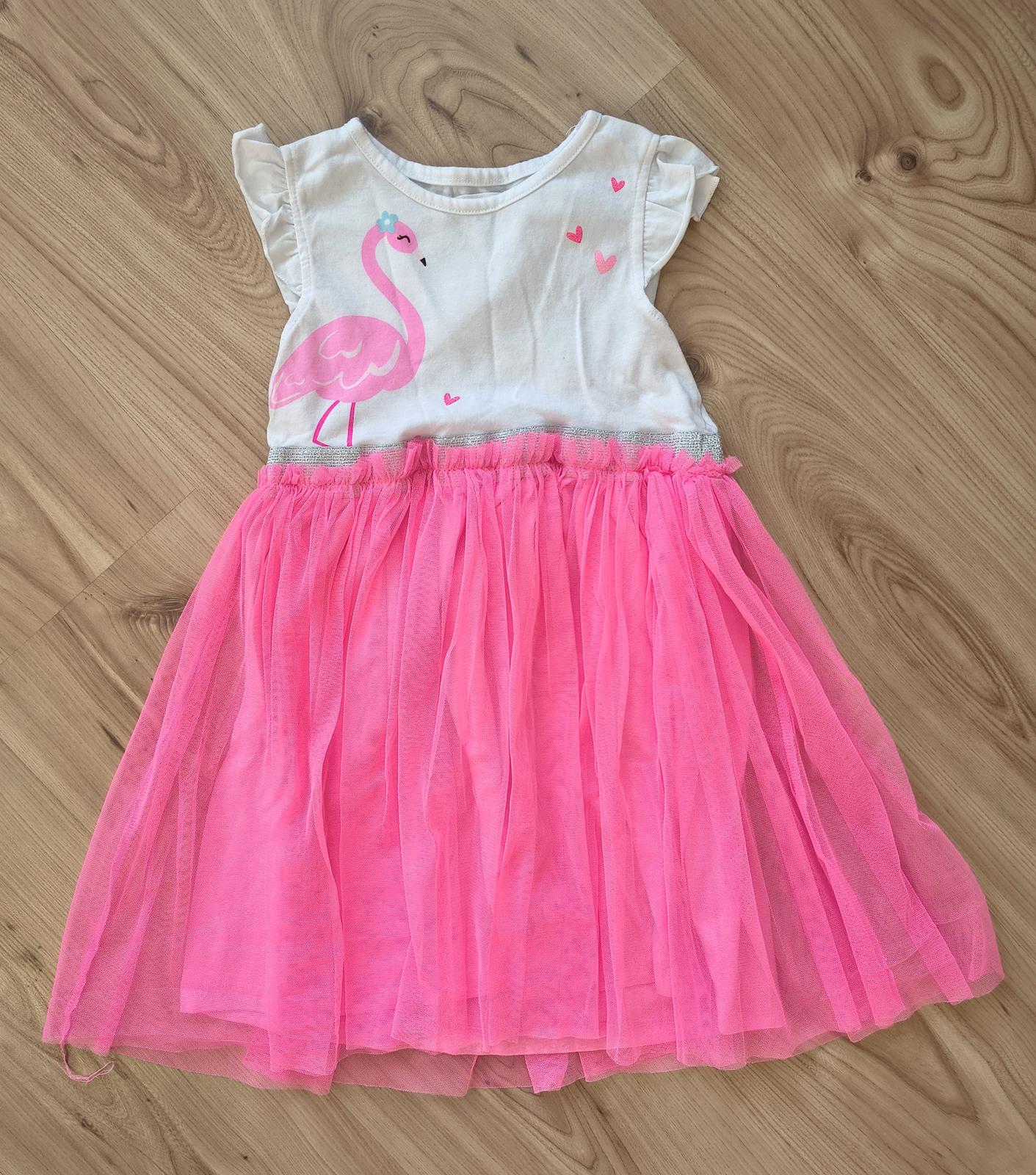 Krásne diečenské šaty, s obrázkom plameniaka a tylovou sukňou sýtej ružovej farby. Oblečené 1x, nepoškodené, veľkosť 116, dĺžka 56cm, šírka 2x27cm.