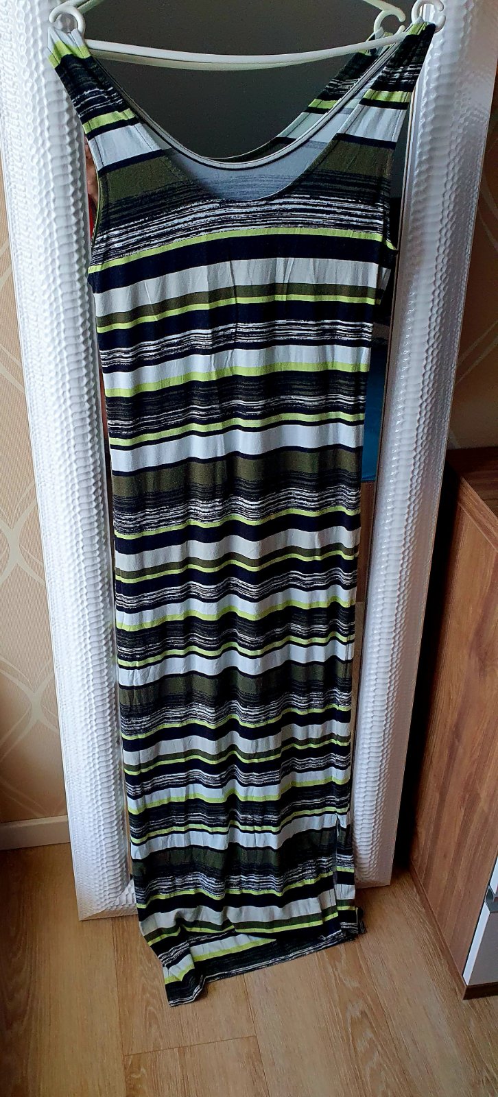 V super stave letne pasikove saty bielo tmavomodre, prsia vypchavky, zavazovanie okolo krku, elasticke. Vrlkost uni, oblecie S aj M. Cena plus postovne