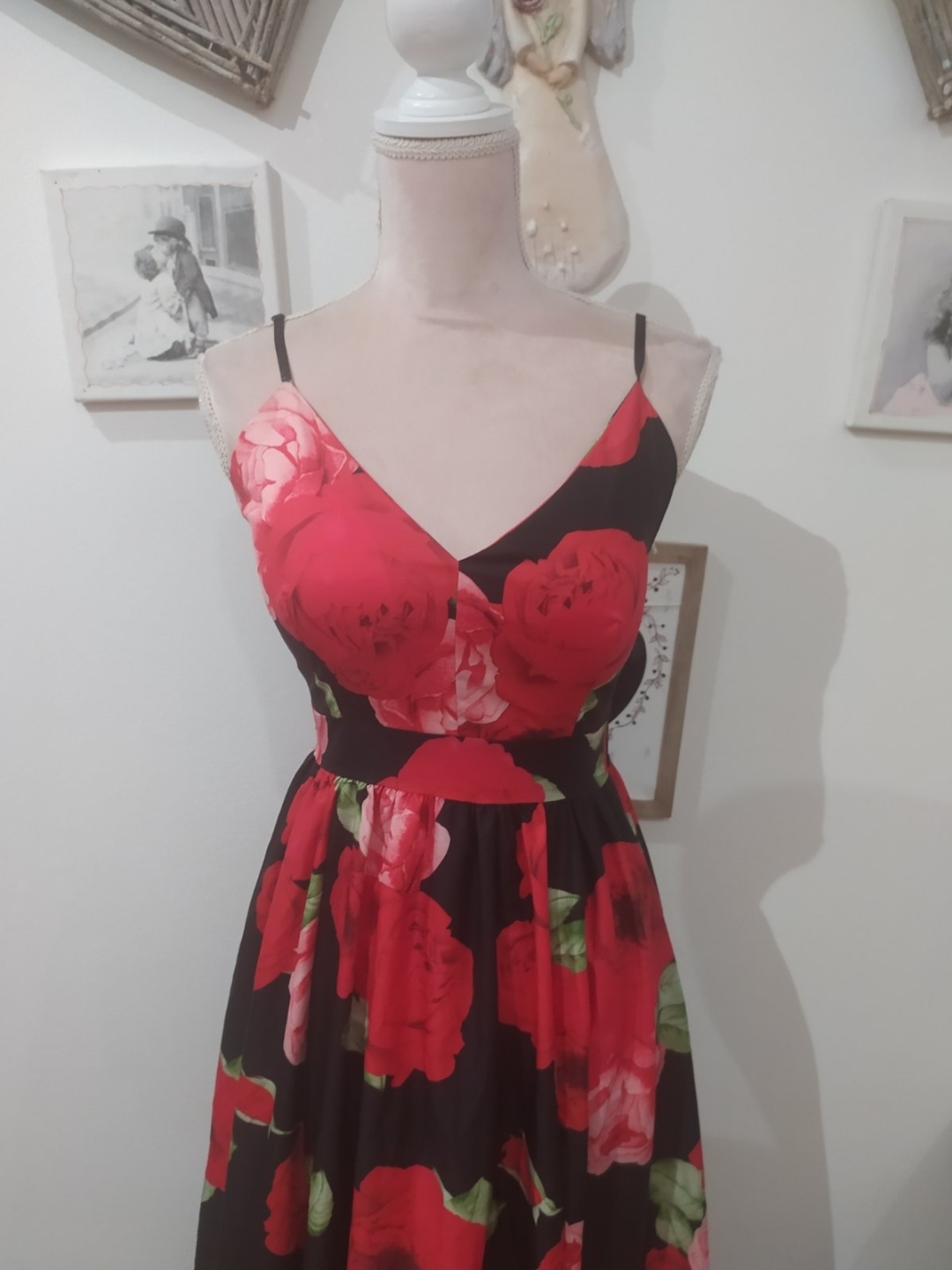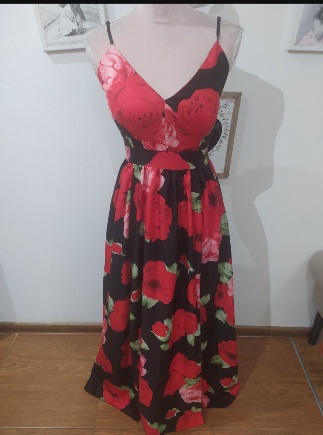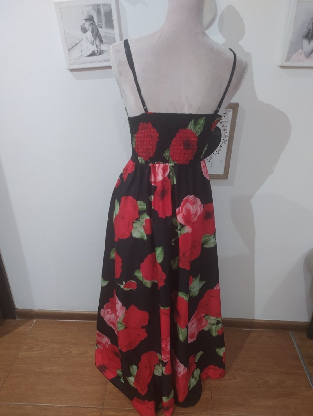 Krásne letné šaty,v top stave,prsia sú vystužené ,zadný diel prešívaný gumičkami,bohato riasená sukňa ,vpredu 2 razporky.Vel Uni vhodné pre veľ S-M