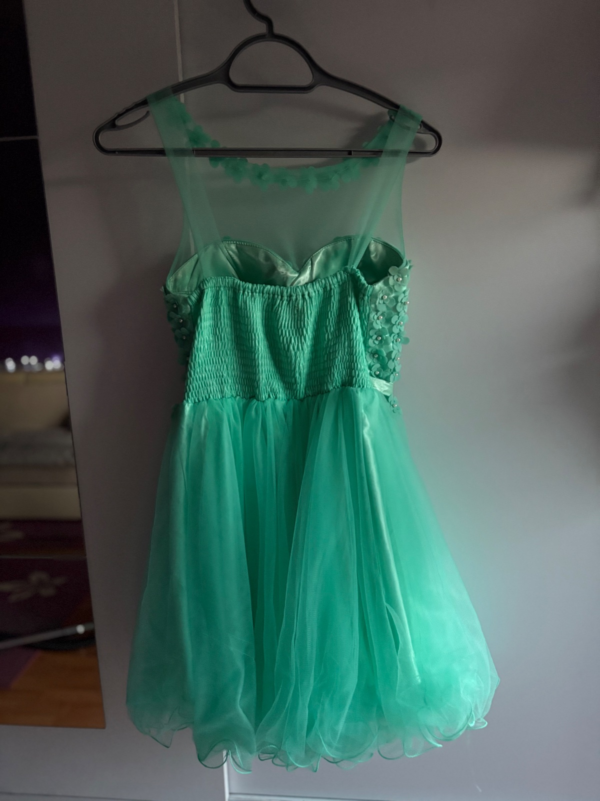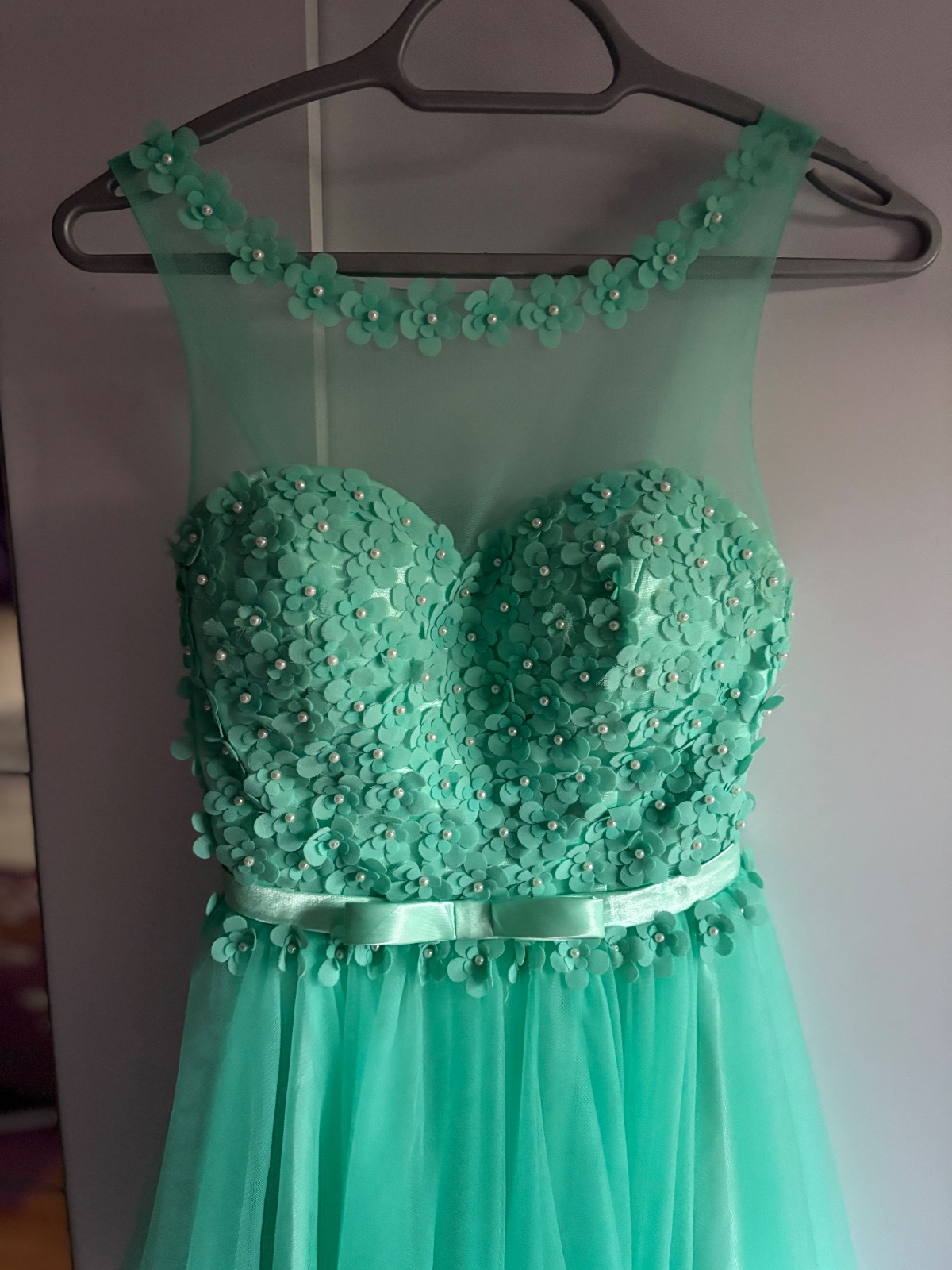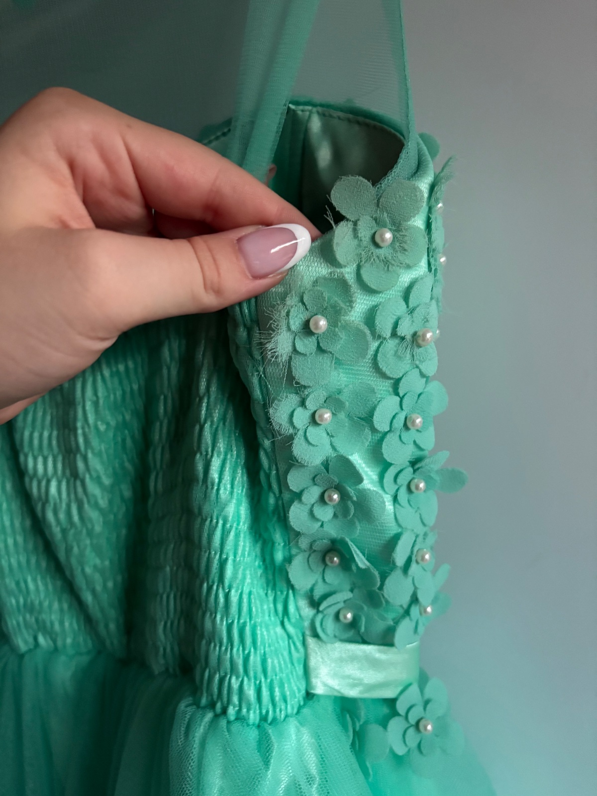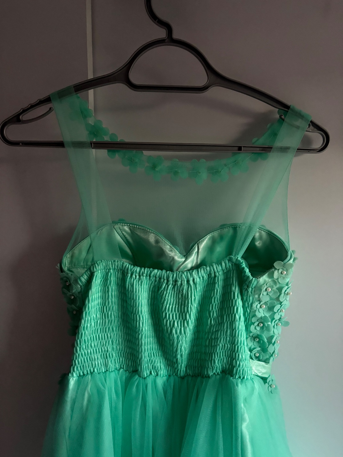 Krásne šaty vhodné na donosenie. Veľkosť od M po L až menšie XL. Vzadu je guma. Šaty majú chybičky krásy niekde chýbajú korálky alebo kvietky sú rozstrapatené od tancovania. Aj jedno rameno je upravené. Boli využite na venček. Niekto šikovný si to dokáže ešte upraviť. Farba je tyrkysová.