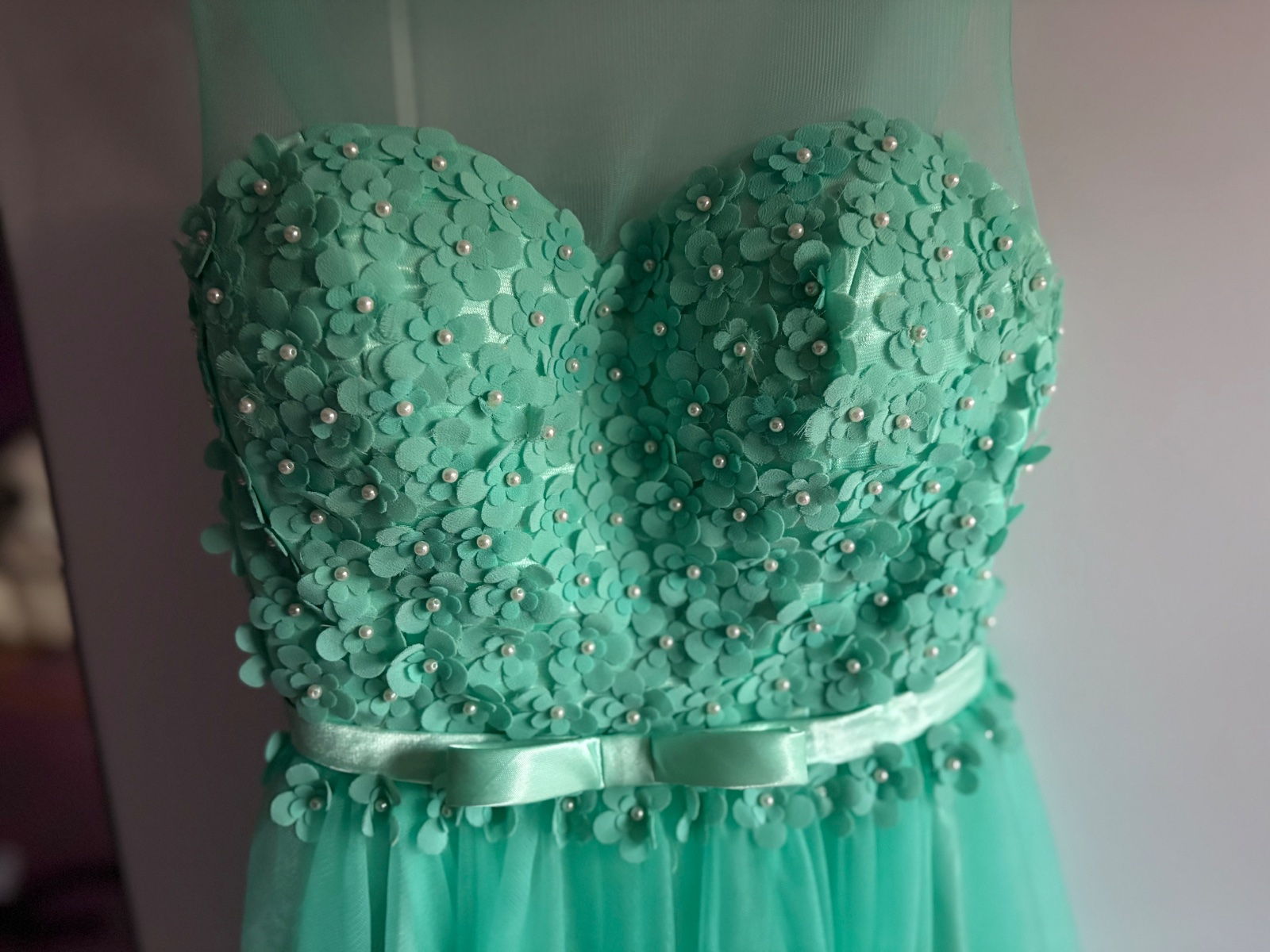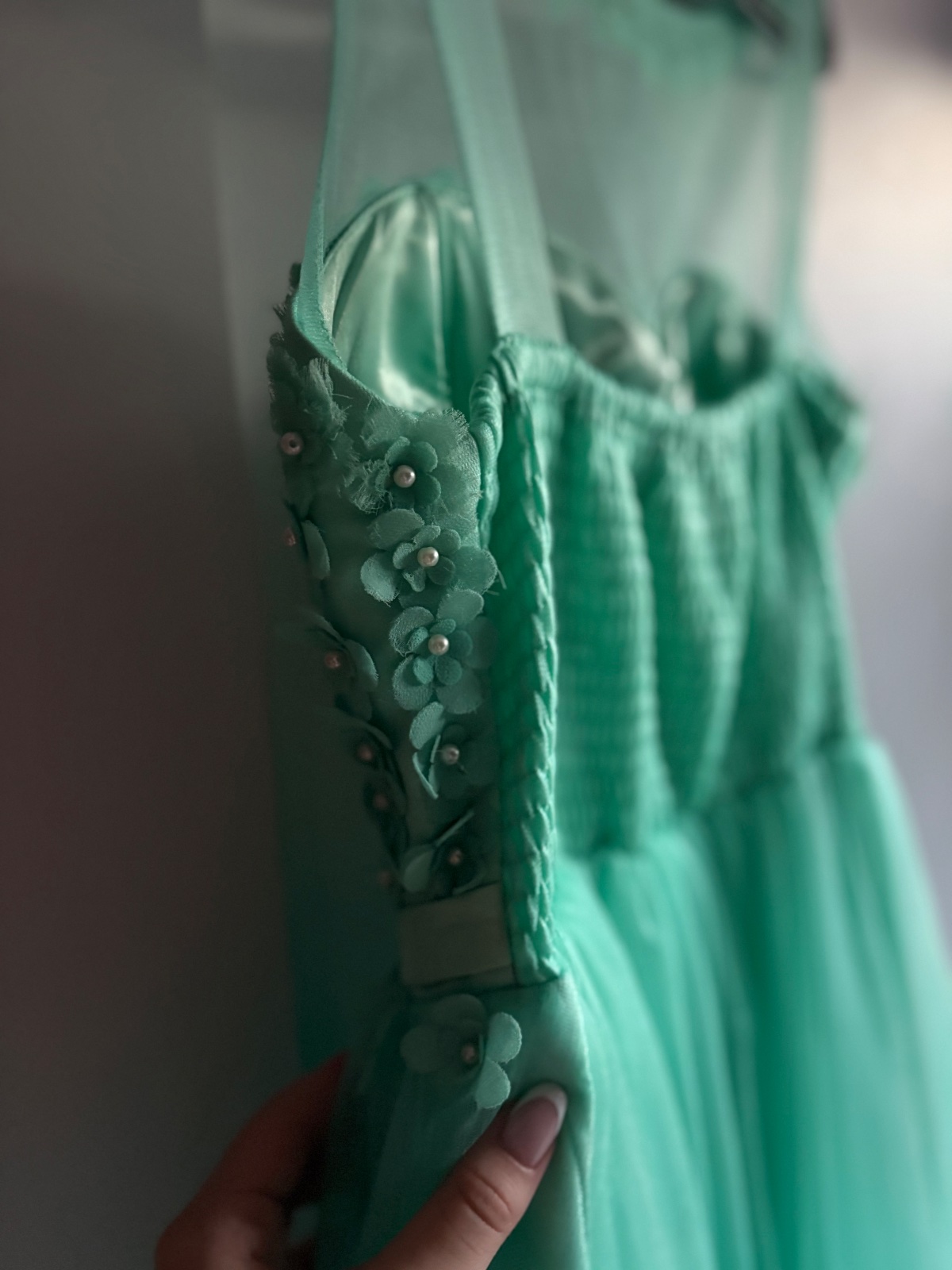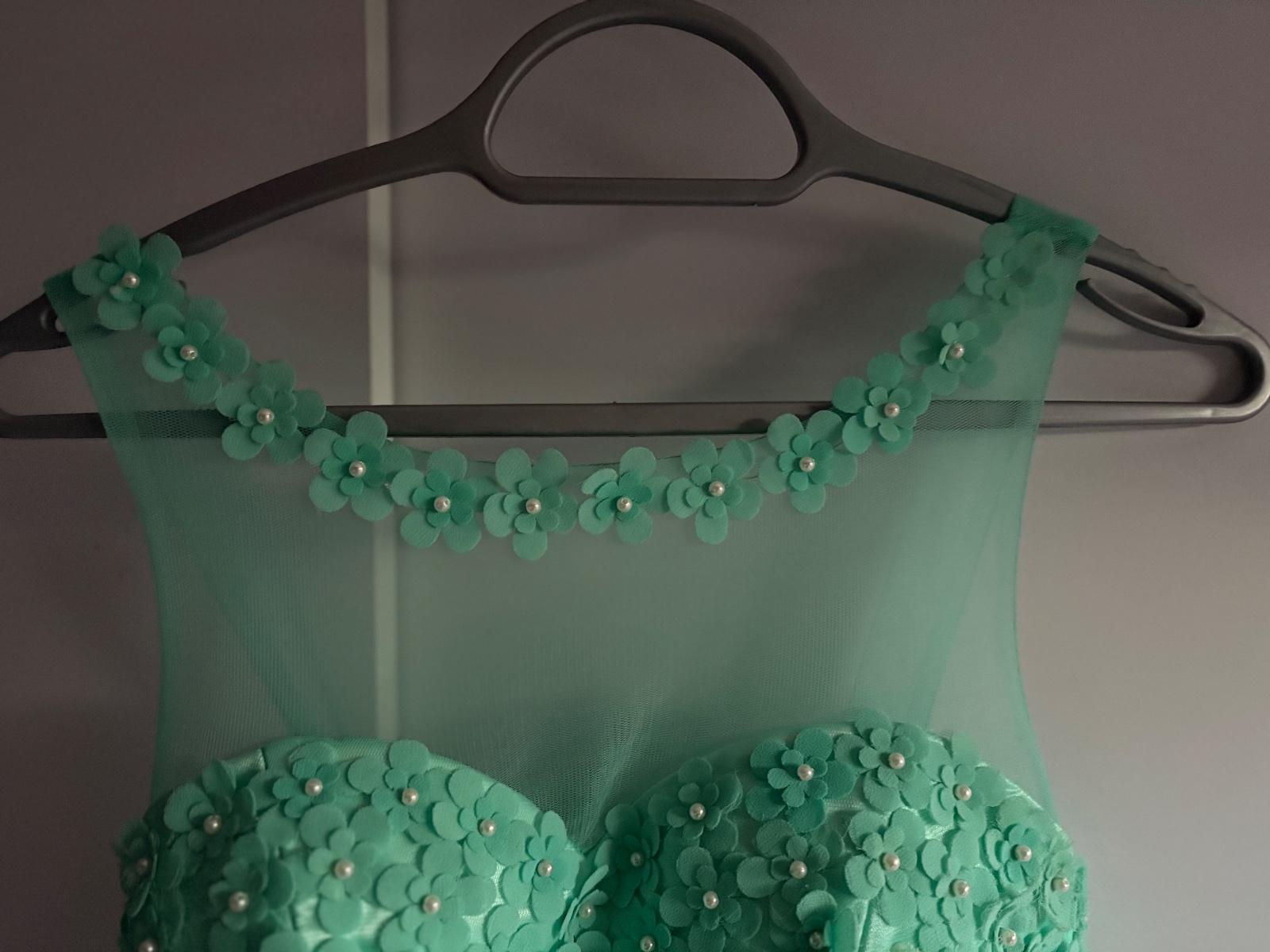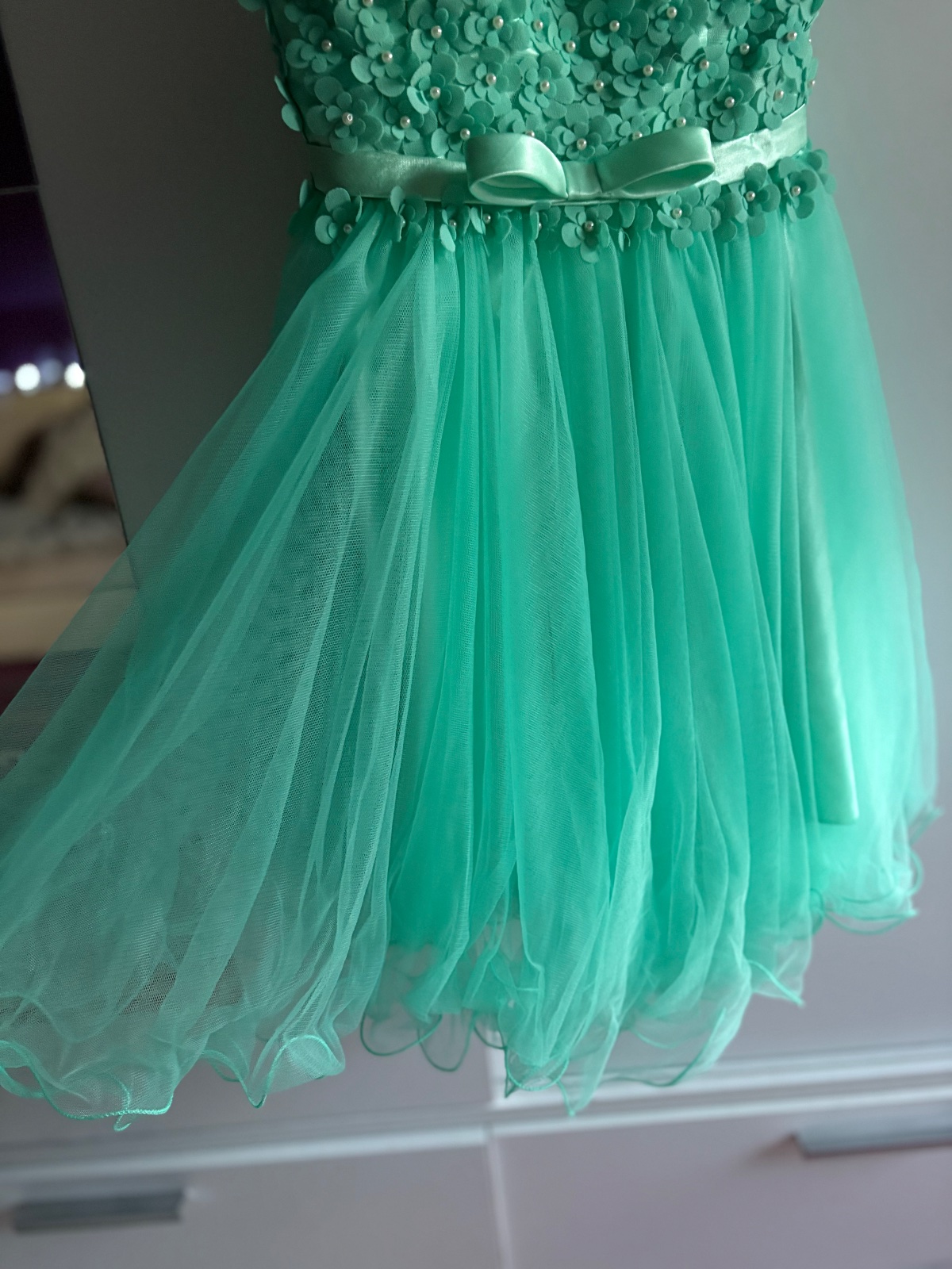 Krásne šaty vhodné na donosenie. Veľkosť od M po L až menšie XL. Vzadu je guma. Šaty majú chybičky krásy niekde chýbajú korálky alebo kvietky sú rozstrapatené od tancovania. Aj jedno rameno je upravené. Boli využite na venček. Niekto šikovný si to dokáže ešte upraviť. Farba je tyrkysová.