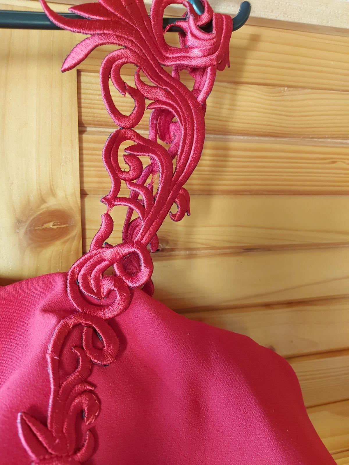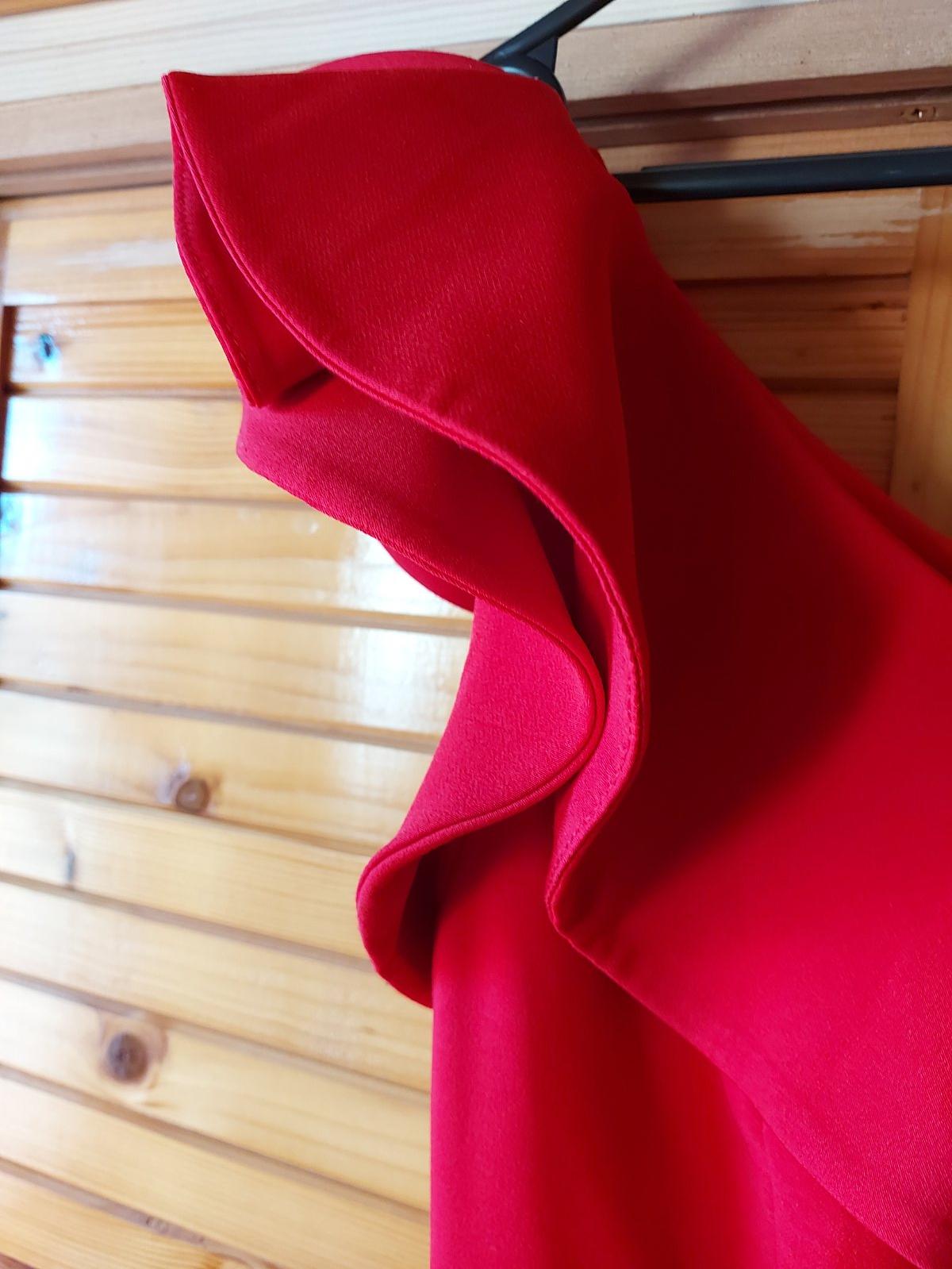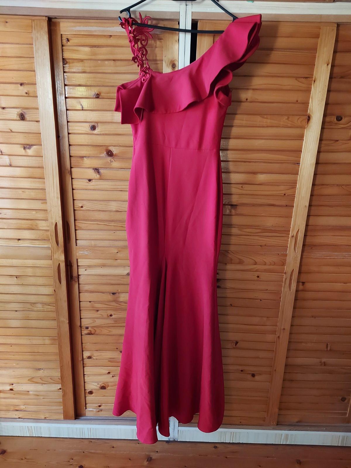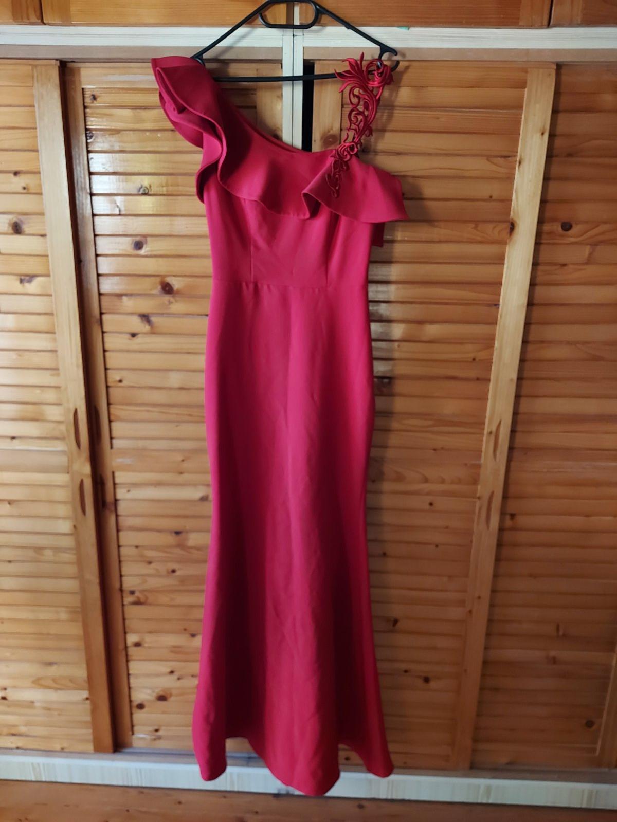Červené spoločenské šaty S, s volánom nad prsiami, na jednom ramene volán, na druhom krásne vyriešené ramienko-viď foto, nepodšité, len prsia sú podšité, mierne elastické, úzky strih, zadný diel od pása mierne rozširovaný, š. pod prsiam-36, d. zadného dielu-142