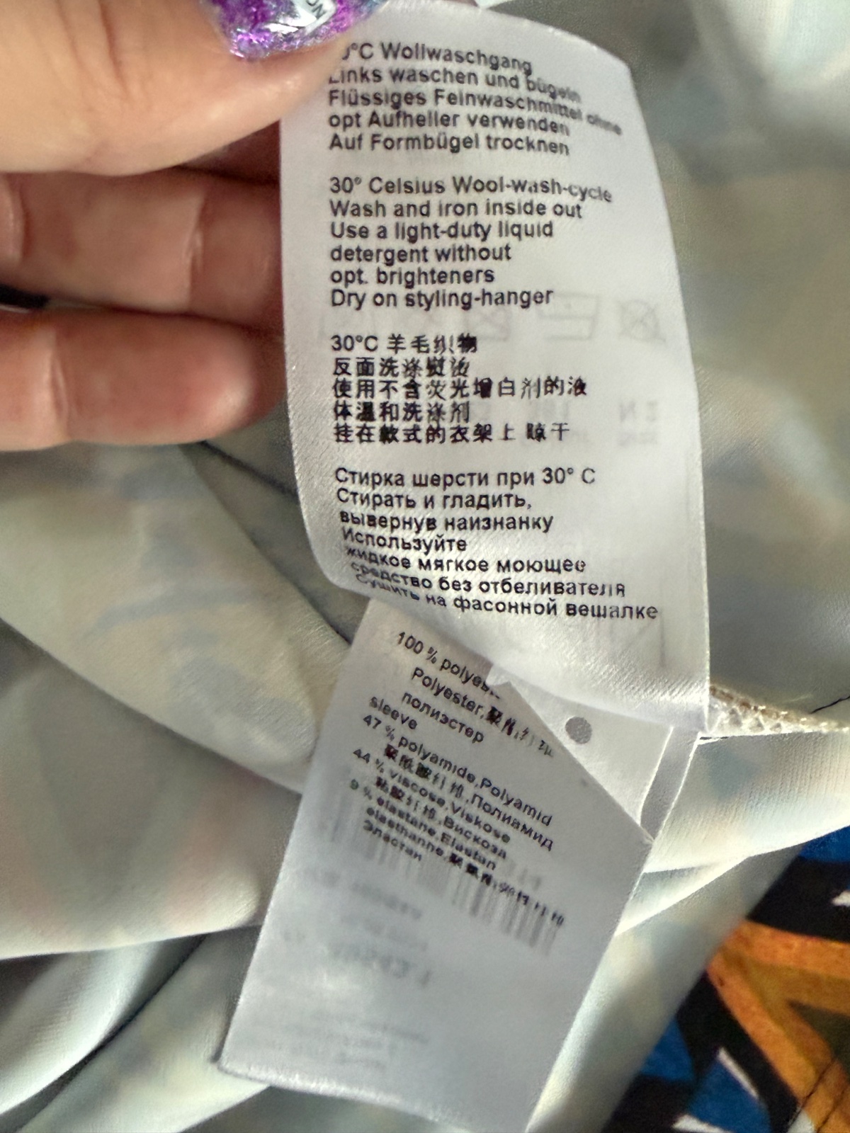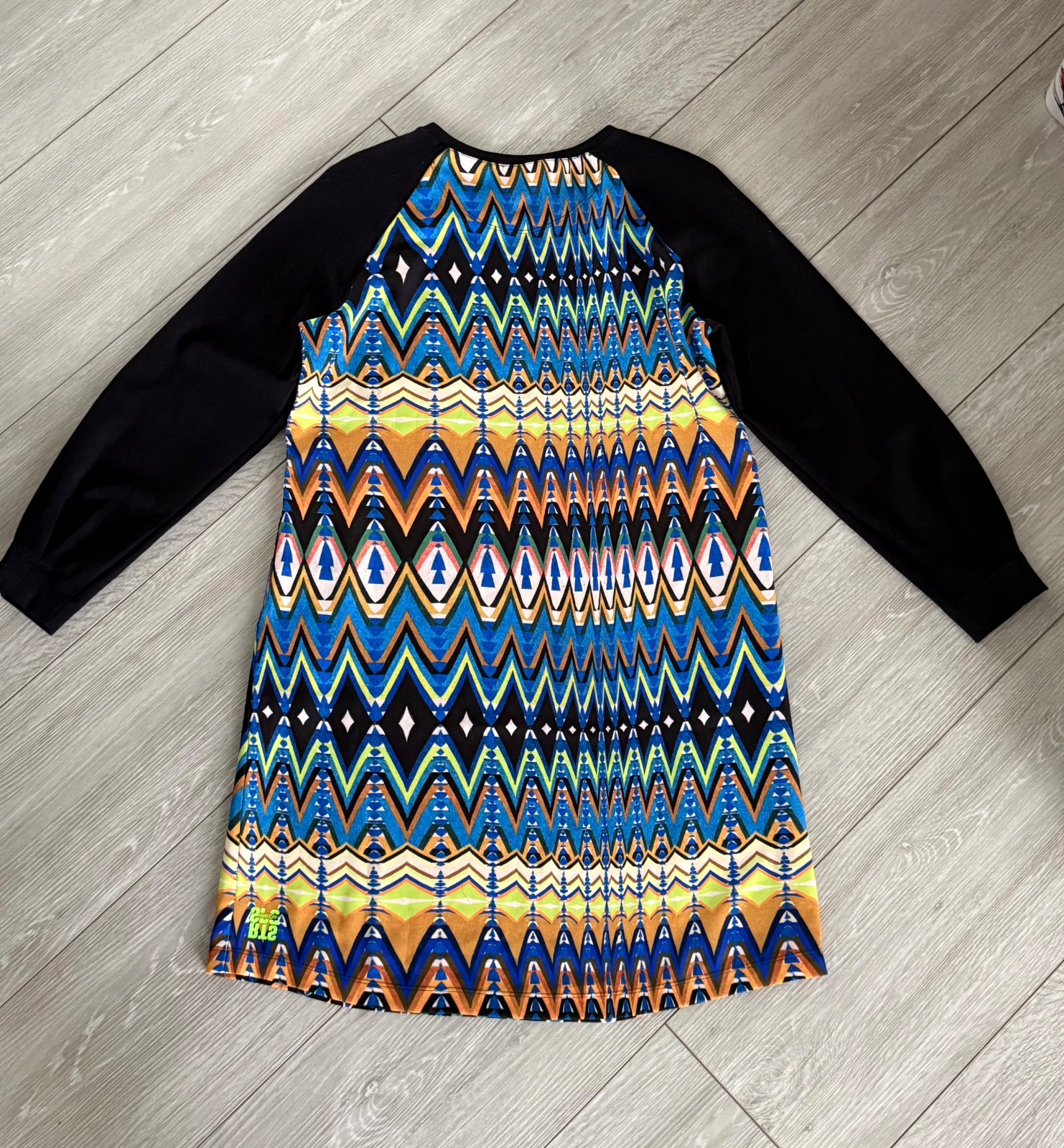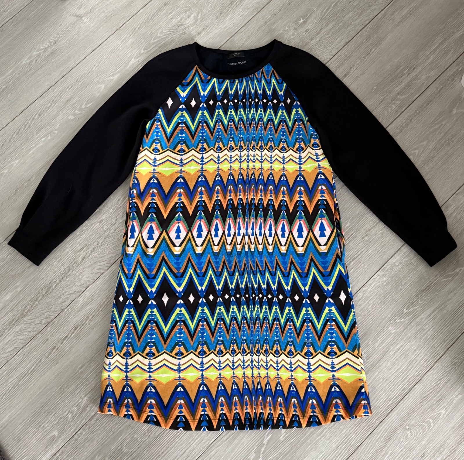 Nádherné farebné mikinové šaty Marc Cain. Po bokoch vrecká. Úžasný materiál na dotyk. Velkosť 2-M. Ako nové. Miery:šírka 52 cm, dĺžka 90 cm.