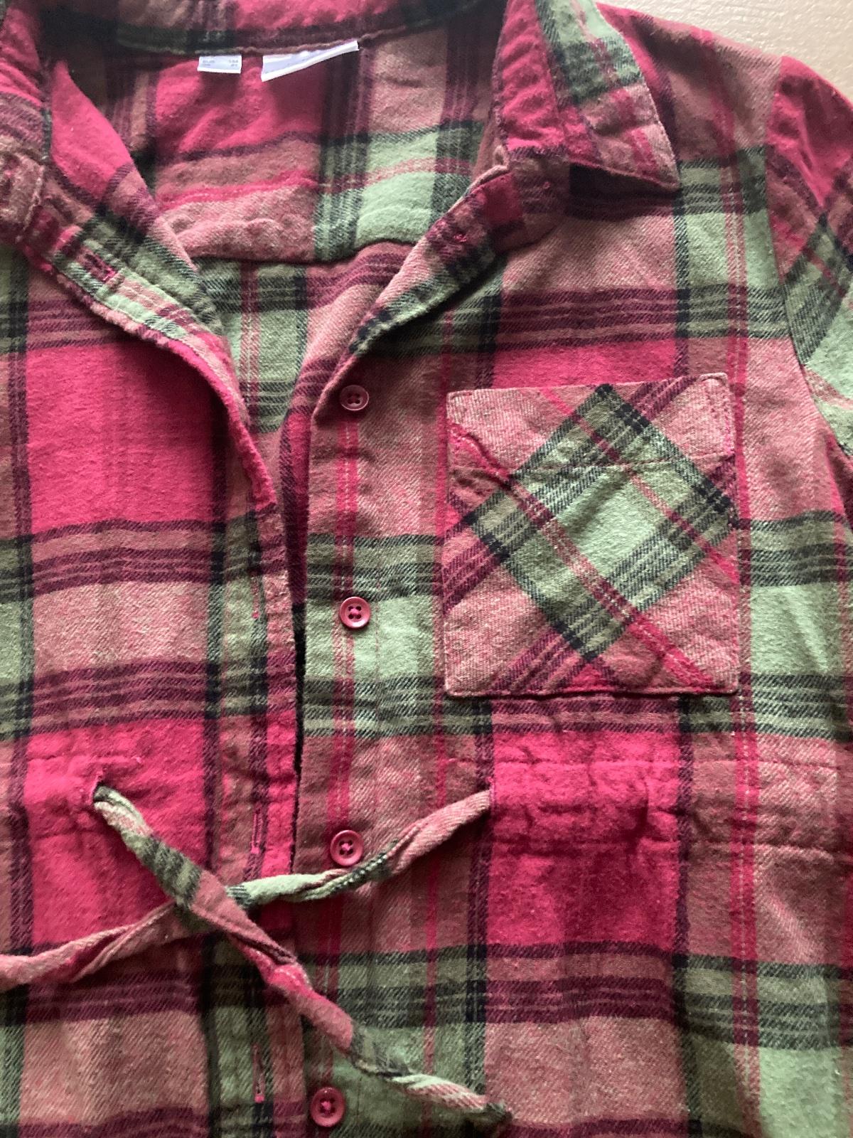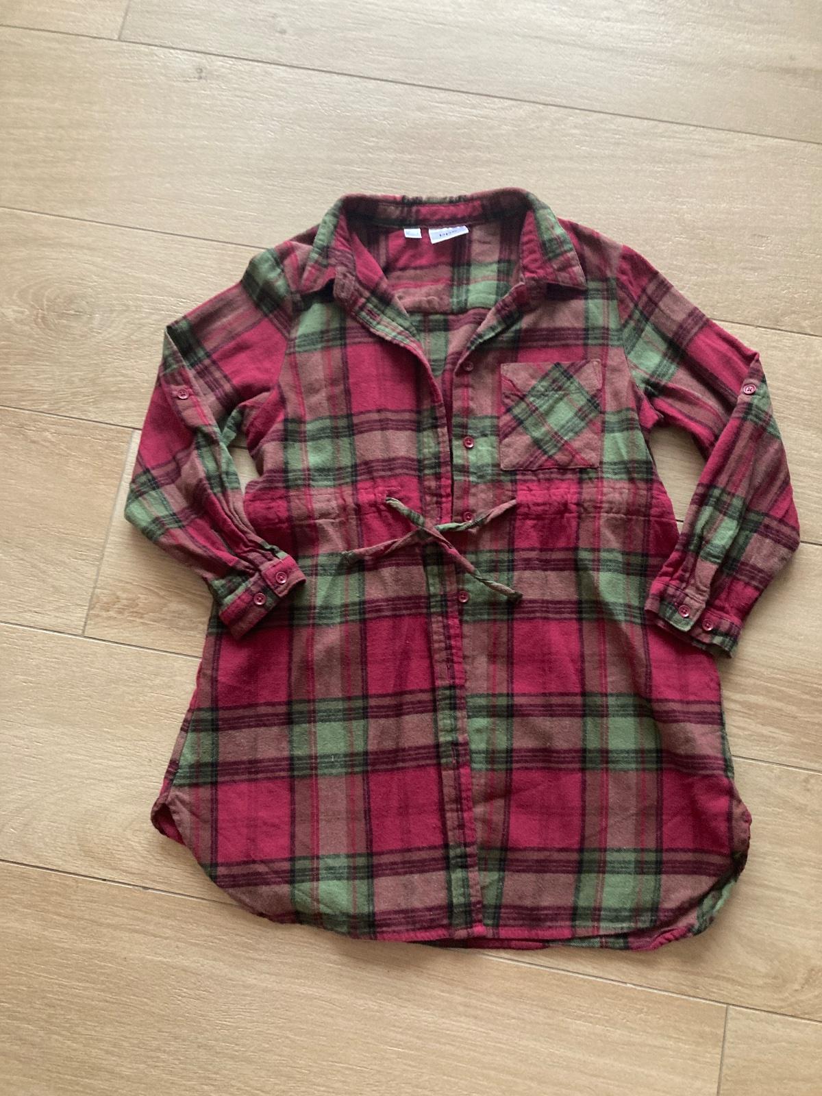 Flanelové, majú jemné žmolky, teplé a mäkké, rukávy sa dajú vyhrnúť, v páse majú šnúrku na stiahnutie, zapínanie na gombíky, k legínam ako stvorené, dĺžka šiat 67 cm, šírka v podpazuší 42 cm, dĺžka rukávu od krku 52 cm, od podpazušia 33 cm.