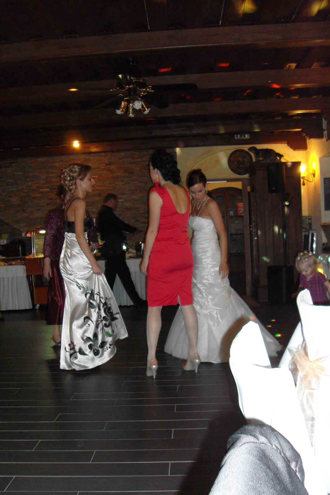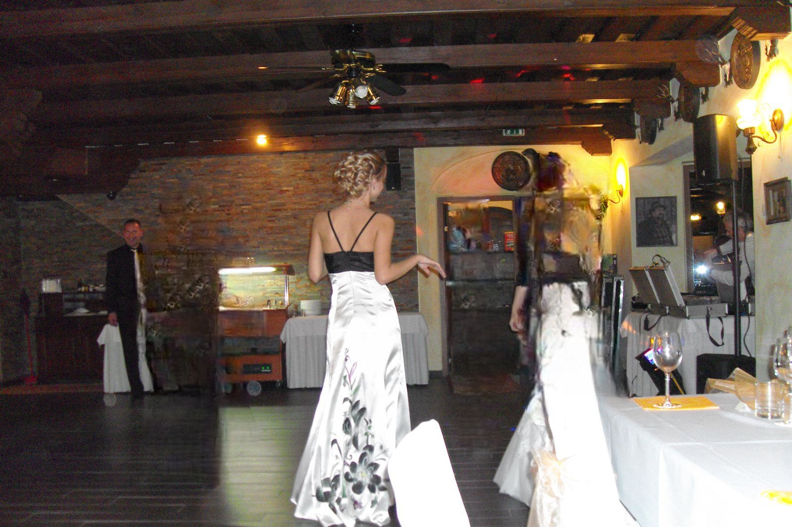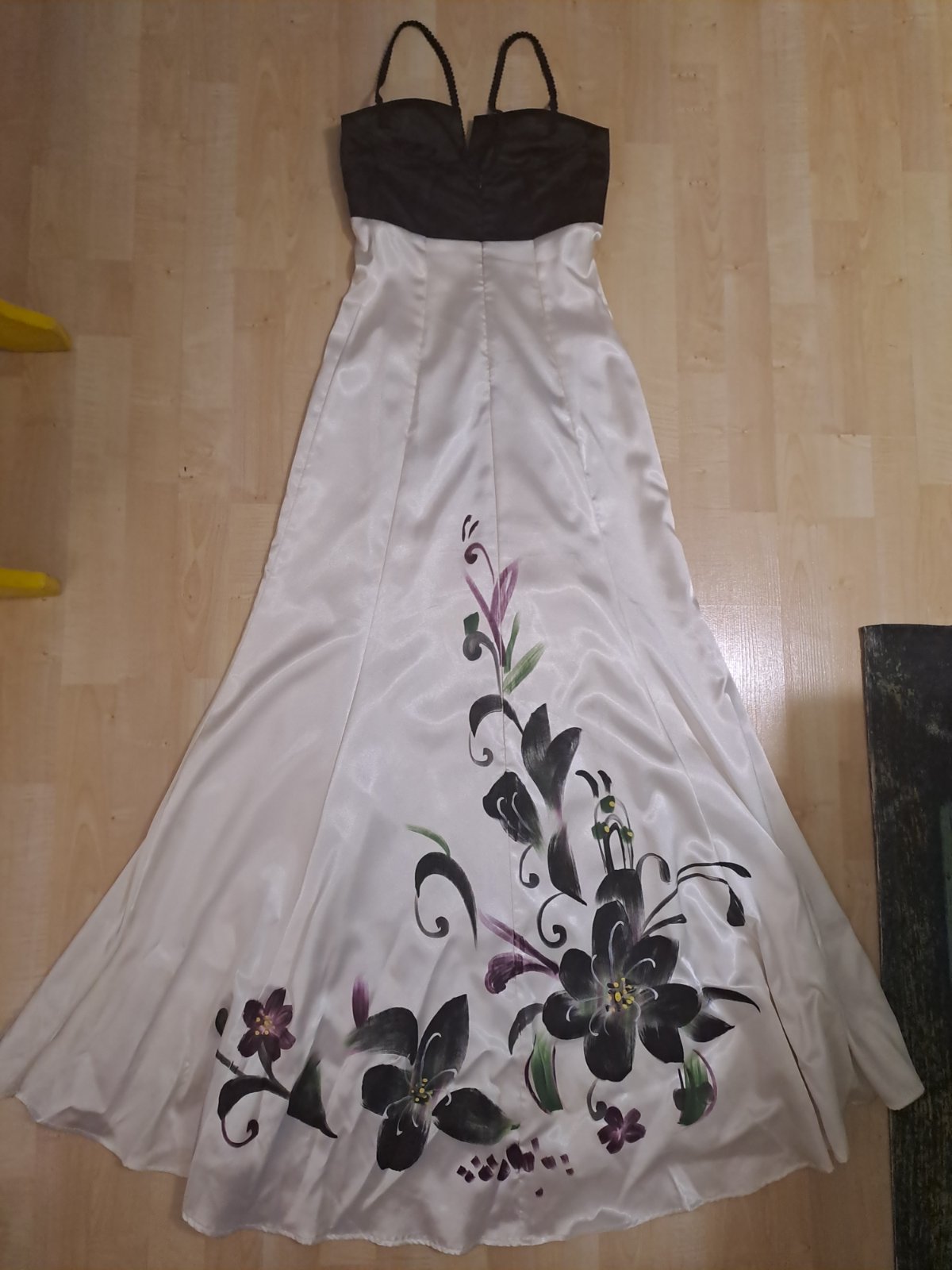 Šaty majú na spodnej časti maľované kvety, materiál látky pripomína lesklý satén. Podšité spodničkou.