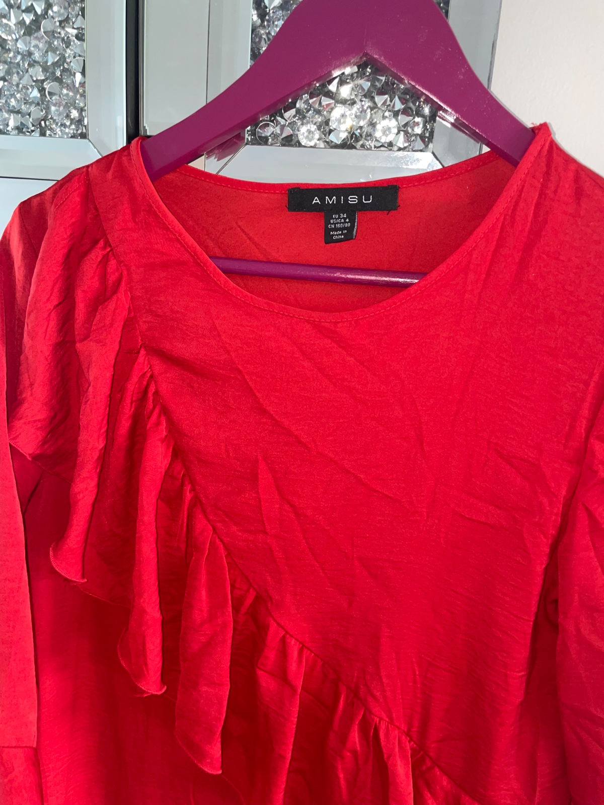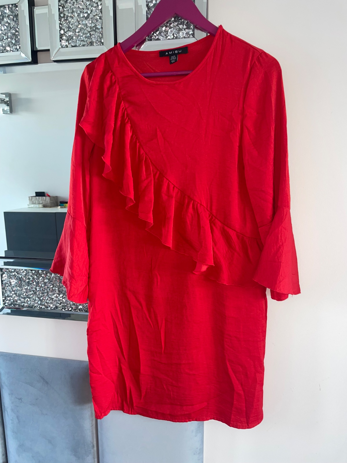 Predám raz oblečené červené jednoduché šaty s ružovým pásikom na bokoch značky AMISU vo veľkosti 34 (XS/S). Super stav bez poškodenia. Cez prsia 46 cm. V páse je 32 cm bez natiahnutia gumičky. Celk...