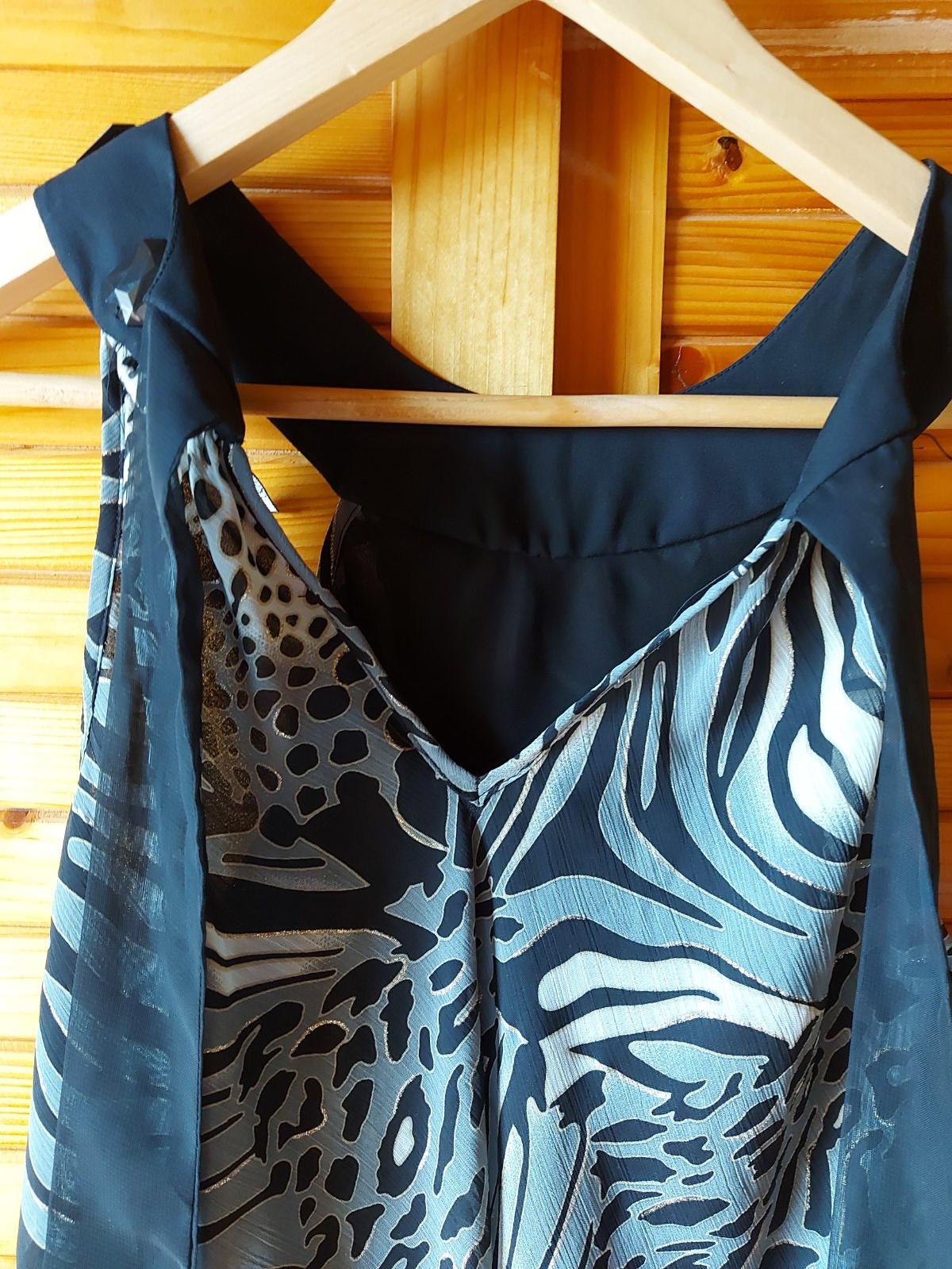 Letné šaty k kamienkami okolo krku-viď foto, S, M /12/, na chrbáte sa zaväzujú so stužkou, padavý materiál, š. pod pachuchami - 48, celková dĺžka - 81, popretkávané zlatou niťou, na spodu šiat je volán