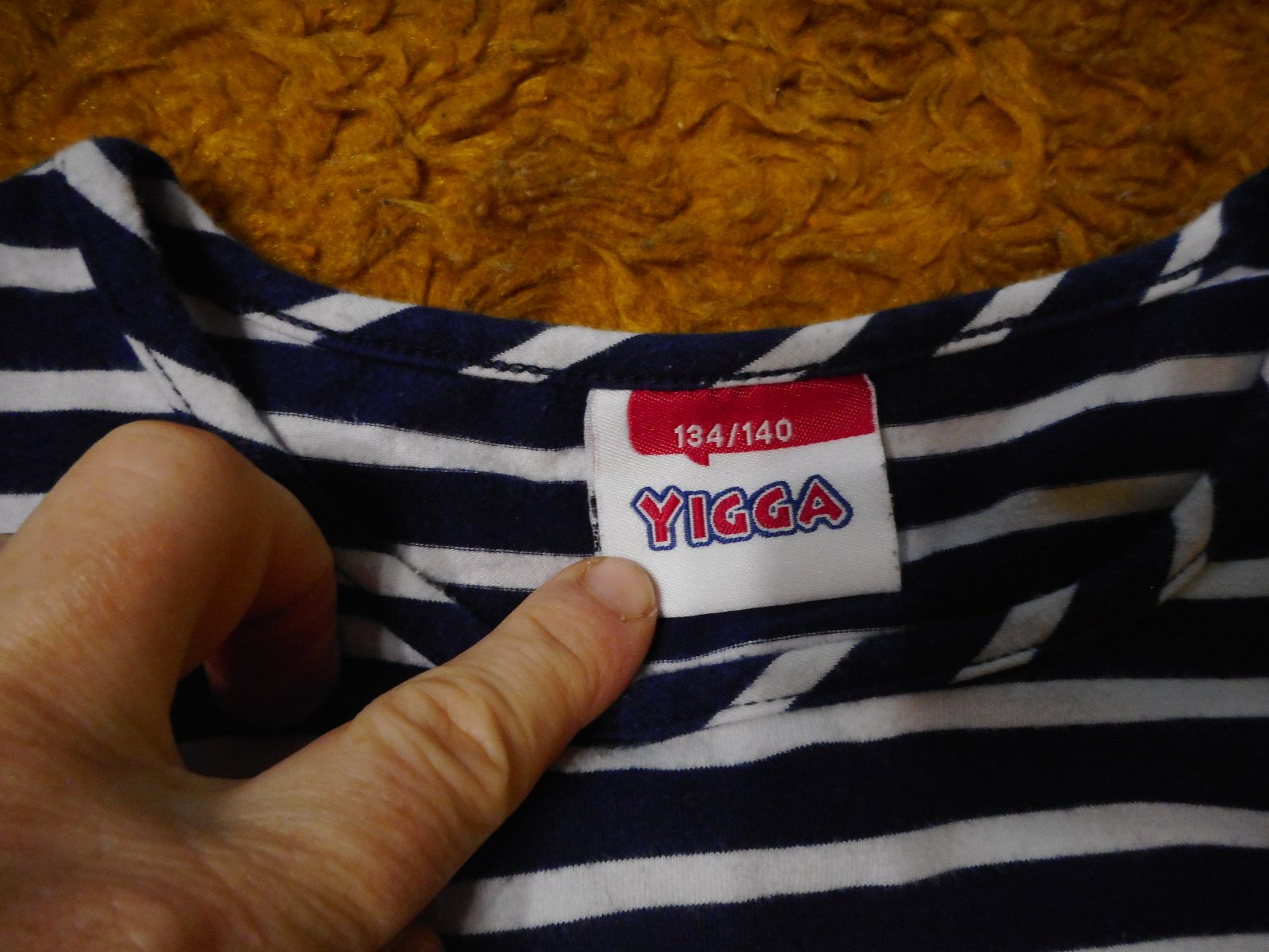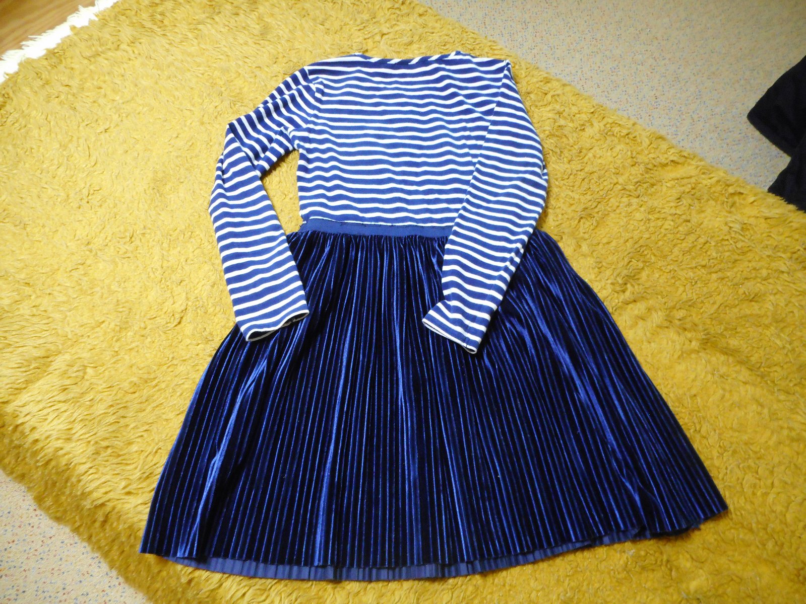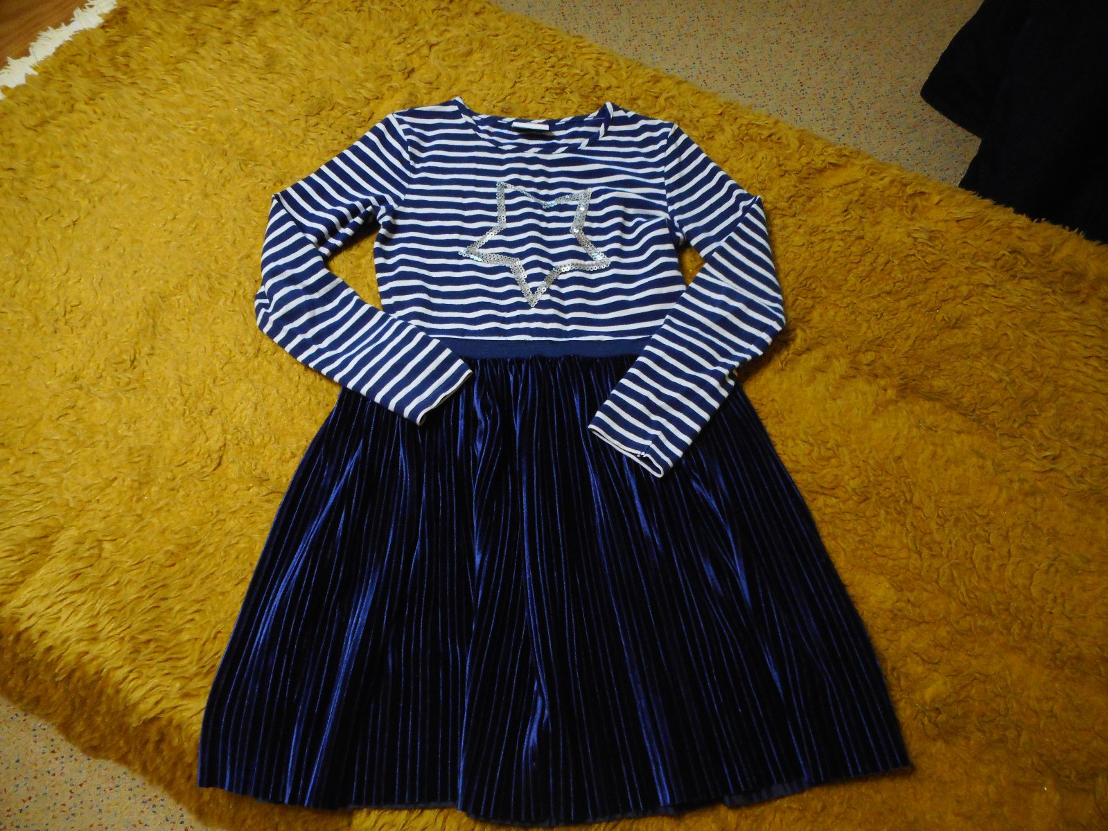 predám používané nepoškodené hrejivé dievčenské šaty s dlhým rukávom na prechodné obdobie veľkosť 134/140cm zn. Yigga s obliekaním cez hlavu, vrchnú časť tvorí elastický pružný materiál s aplikáciou hviezdy v námorníckom štýle pásiky striedajú sa farba modrá a biela, pás tvorí tmavomodrá gumička, suknička je tvorená skladanou látkou akoby semišovou, celková dĺžka šiat je 78cm, šírka gumičkového pásu je 34cm, ešte povolí, šírka pod pazuchami je 39cm, vonkajšia dĺžka rukávu od šitia ramena je 54, vnútorná 41cm