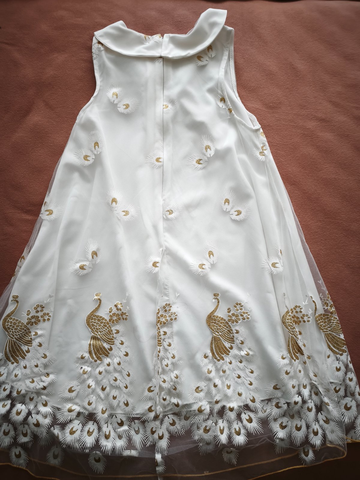 Šaty priležitostné, vzor pávy zso zlatymi trblietkami vyložene, 1x oblečené, bez poškodenia