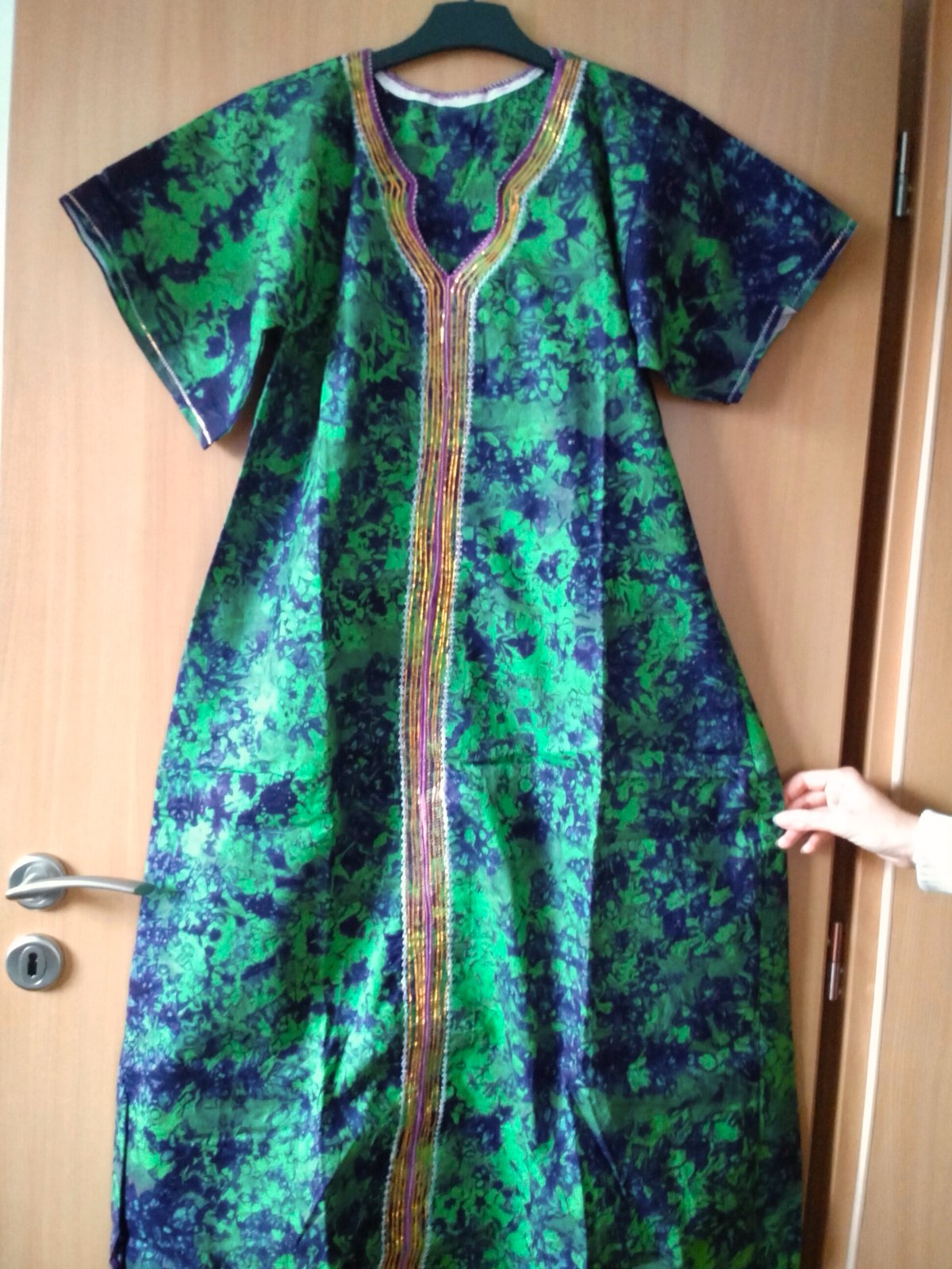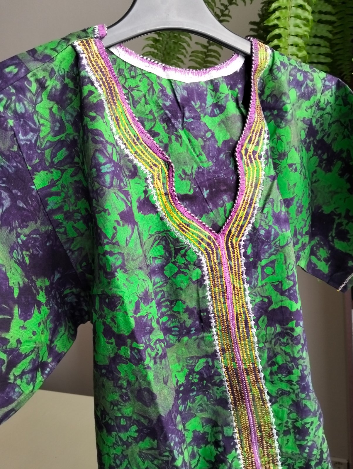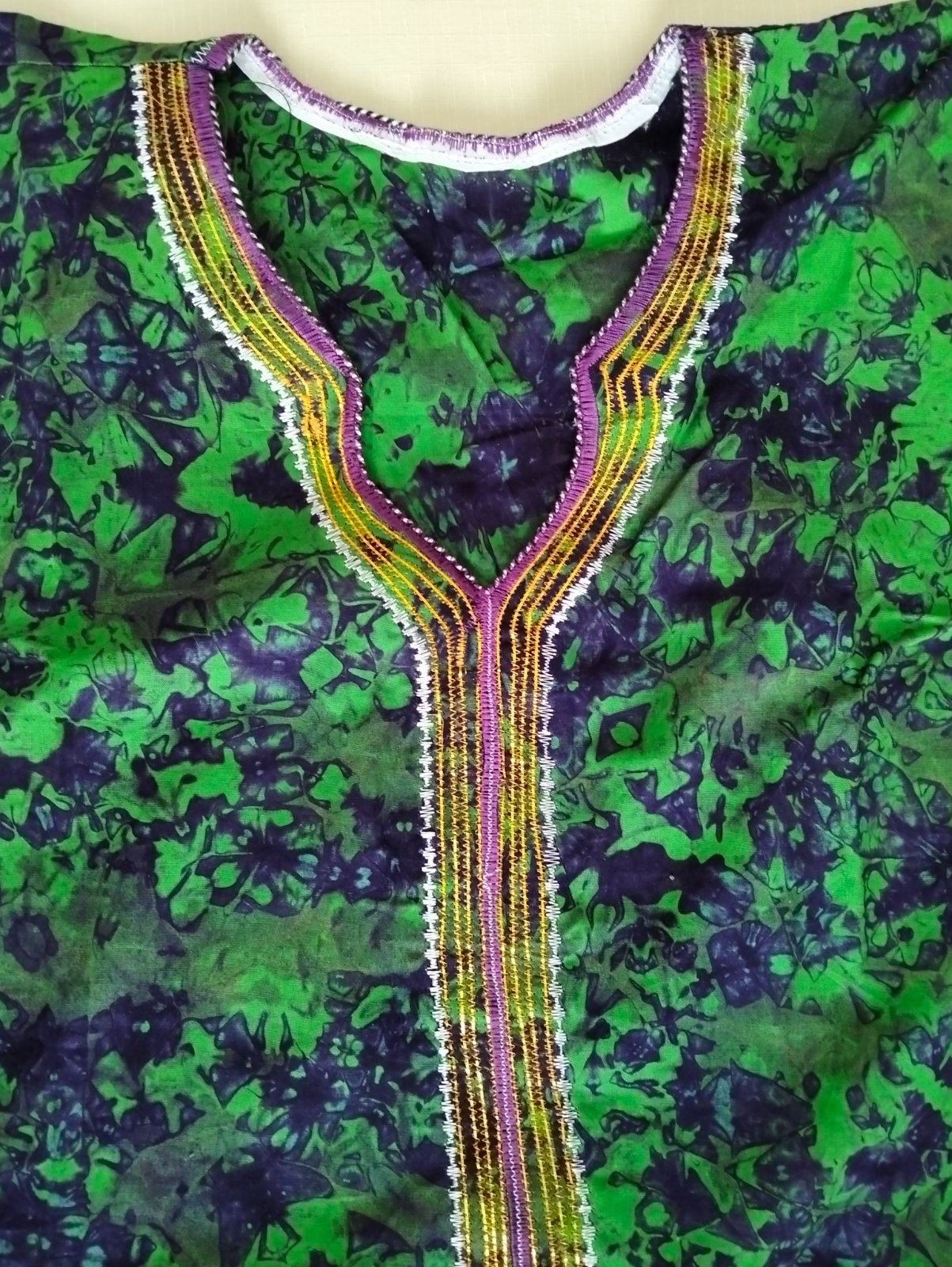 Látka je pevná s fialovo zeleným vzorom a fialovo zlatou výšivkou v dekolte a v strede pozdĺž celých šiat. Strih šiat sa postupne rozširuje do A. Veľkosť L/XL.