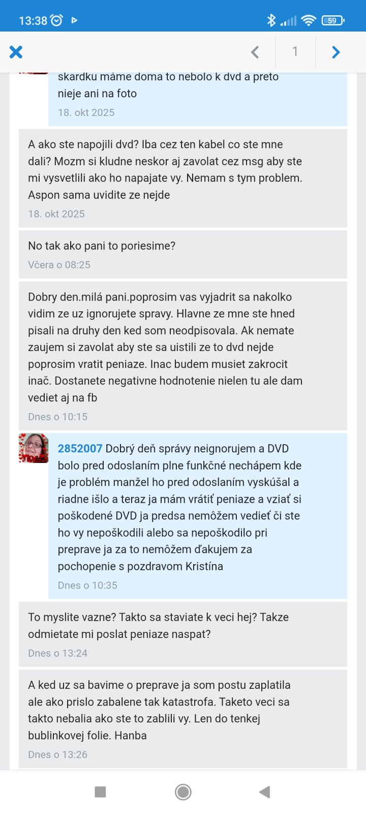 Ja sa nemám za čo hanbiť milá pani DVD bolo riadne odskúšané a aj zabalené riadne v bublinkovej obálke keď Ste chcela zabaliť inak mali Ste si to aj zaplatiť a keď ide o skart kábel ktorý stále omielate tak si pozrite fotky či tam je určite nebudem dávať kábel k DVD keď mám doma novšie DVD kde som kábel potrebovala a Vaša prefotená konverzácia dajte ju sem celú a nie len čo sa Vám hodí a ako viete že nefunguje cdroomka? Vy Ste niaky odborník opravár čo sa tomu rozumie alebo viete presne čo Ste pokazili? To je otázka na zamyslenie prajem všetko dobré