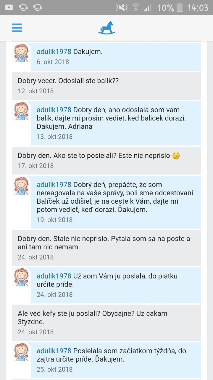 Nerada to píšem, lebo ešte sa mi to nestalo, ani nijako nechcem mamičku očierňovať, ale je mi trošku ľuto, že peniažky som zaspala mamičke hned ako mi poslala udaje k platbe, čo bolo hned na druhý den ..nakoľko som potrebovala pre dcérku svetrík na vystupenie, za svetríkom čakám už tretí týžden, kde mi mamička napísaa, že ho pošle, potom, že mala choru dcérku, nakoniec že už poslala, ale nič nedošlo a mamička mi neodpovedá. Ja všetko chápem, aj ked su detičky choré, ale ja som si zato zaplatila čo najskôr ako som len mohla, ale čakať za vecou tri týždne je veľa a ešte k tomu ak to potrebujete a už ste si zato zaplatili. Nič proti, to je len moje hodnotenie, nehovorím o mamičke že je zlá.