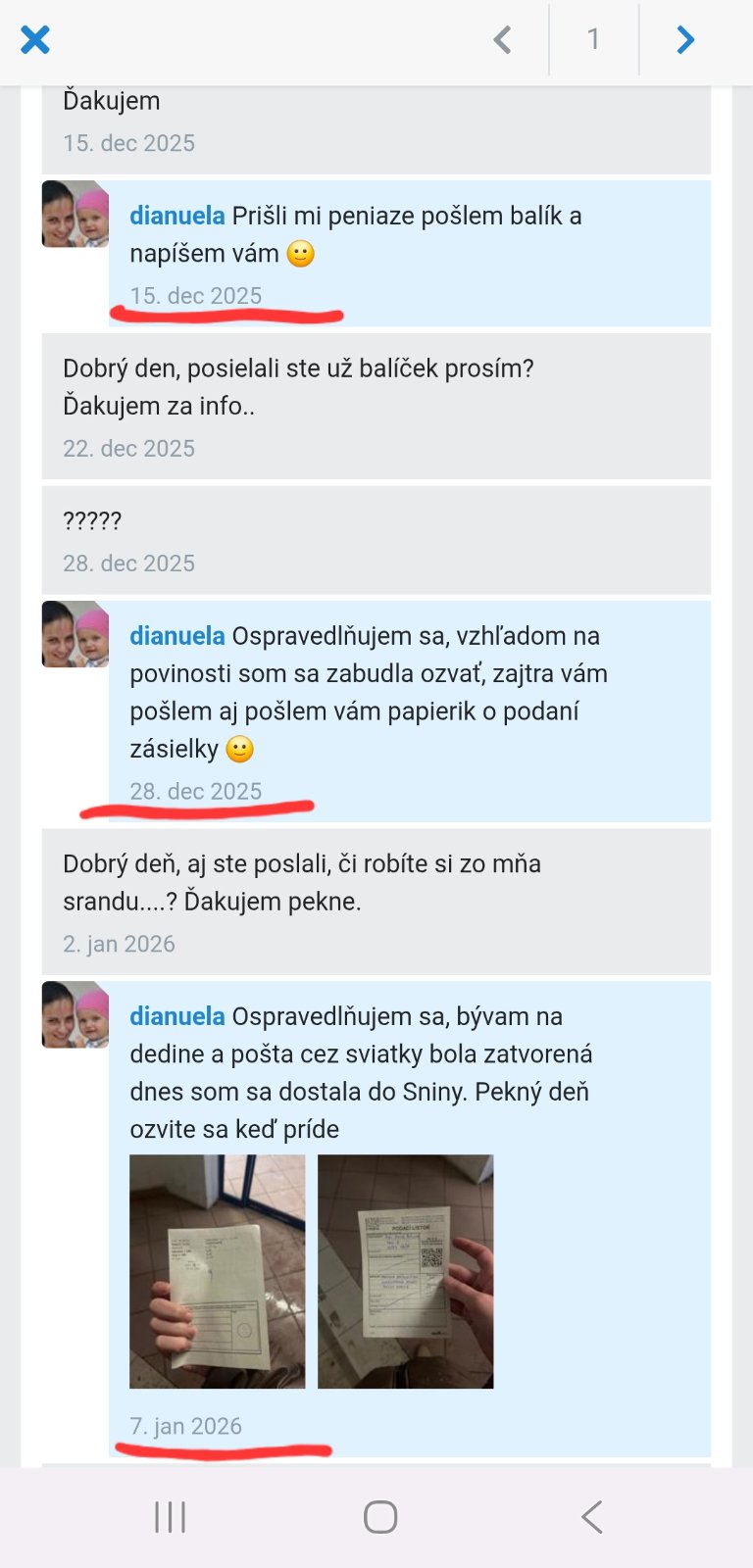 Nemám čo uvádzať na pravú mieru, jasne som uviedla, že kabelka nakoniec prišla a v poriadku. Takisto ospravedlnenie, že ste mali iné povinnosti (to však máme všetky ženy, žiadna z nás si neškrabká doma zadok..), že ste zabudla a bývate na dedine som prijala🙂 Ja osobne by som sa prepadla od hanby, keby mám niekoho peniaze na účte, a nehlásim sa mu, ale aj tomu rozumiem, že každá to máme nadstavené inak.. Toto nemá byť kritika, len čisto holý fakt a info pre budúce nakupujúce, aby sa zariadili, že odpisujete po 1 až 2 týždňoch, a doručenie tovaru môže byť 4 týždne (ako vidno v našej komunikácii na foto) 🙂 Ďakujem ešte raz za kabelku, pekný deň prajem
