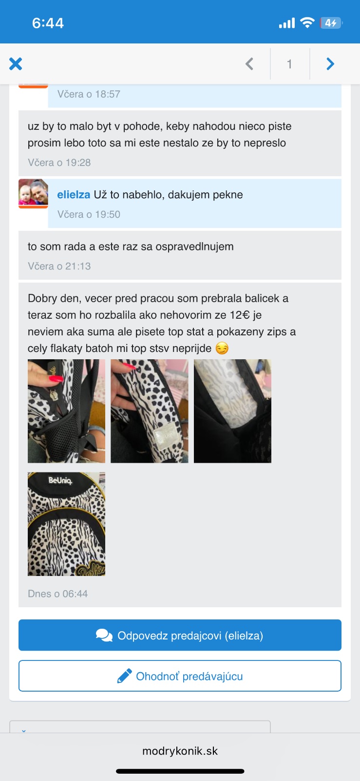 kupila som vak… zo zaciatku komunikacia super, pani bola ochotna batoh rychlo poslat… v inzerate bolo uvedene top stav… za mna top stav nie je ked ze pokazeny zips a vak cely flakaty… foto som pani poslala… navrha mi ze mi vrati 8€ (batoh stal 12 plus posta) a batoh si mozem nechat, ze nech usetrim na postovnom s cim som nesuhlasila a napisala som ze som ochotna zaplatit len jedno postovne nakolko stav nezodpoveda popisu a ja pokazeny batoh nechcem… odvtedy bez komunikacie….