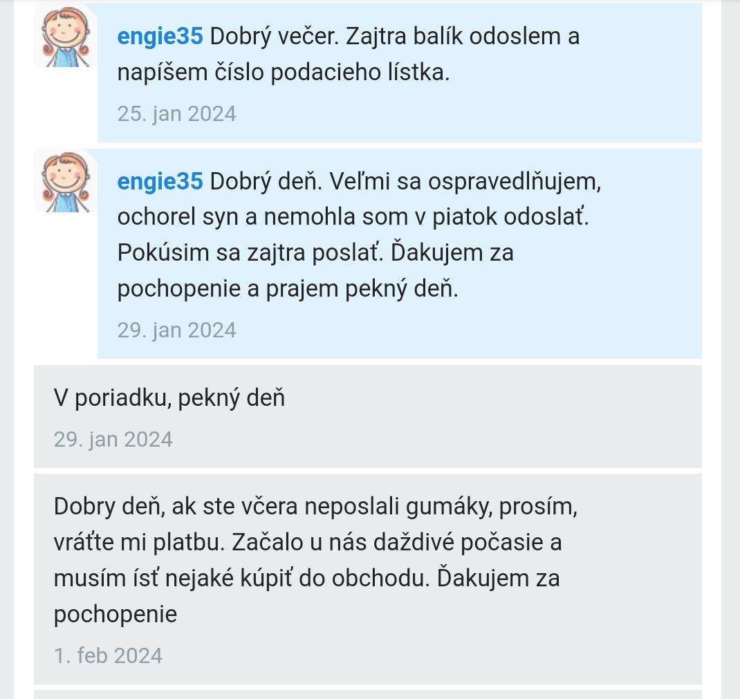 Keď mi predávajúca (z dôvodu choroby dieťaťa) nebola schopná za týždeň poslať gumáky, ktoré som urgentne potrebovala, tak som ju poprosila, aby mi vrátila platbu a gumáky neposielala, lebo už som nemohla dlhšie čakať a musela som ísť kúpiť gumáky do obchodu. Samozrejme, že mi platbu nevrátila, ale po týždni a pol od objednania mi domov došli gumáky, ktoré som už od nej nepotrebovala, vraj si správu neprečítala, aj keď som jej ju napísala dávno predtým, ako išla na poštu. Vzniknutú situáciu odmieta riešiť.
