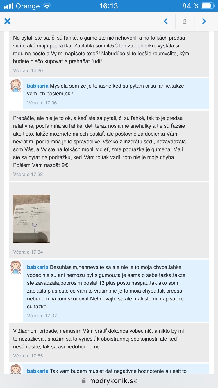 Skutočne toto bola nepríjemná skúsenos a ešte som sa tu nestretla s takou arogantnou osobou, ktorá absolútne nerešpektuje prostredie tejto komunity a pravidlá slušnosti a myslí si, že každý bude tancovať ako ona píska. Je na uváženie, či tých pár euro stojí niekomu za to, aby si presadil svoje. Na ukážku pridávam kúsok z našej konverzácie, posúďte sami…