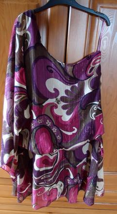 Predám blúzku na jedno rameno, s netopierým rukávom. Minimálne nosená. V páse na opasok (nie je súčasťou). Vhodné k legínom. Pekne sa prispôsobí postave, padavá.
