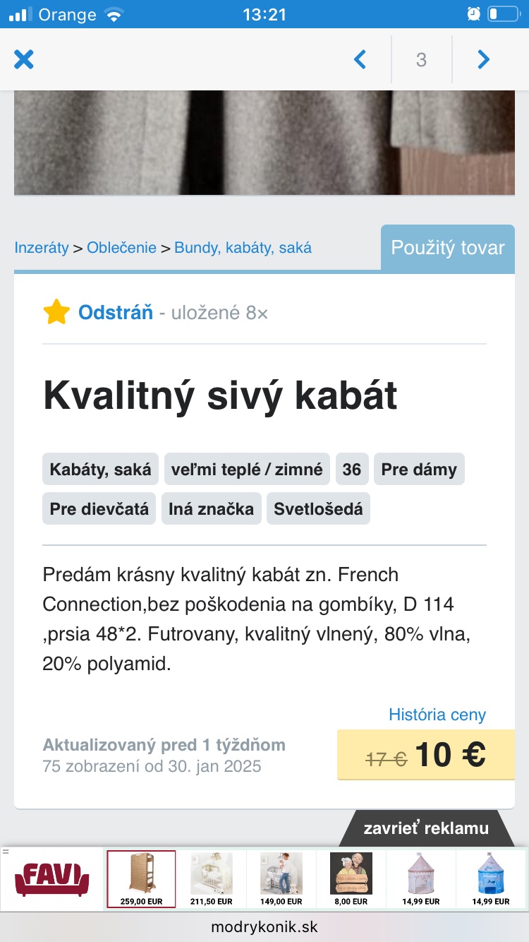 Bohuzial, musim dat negativne hodnotenie, pani mi ani neodpoveda, kabat prisiel poskodeny na dvoch miestach napriek tomu, ze v popise bolo uvedene, ze je bez poskodenia.