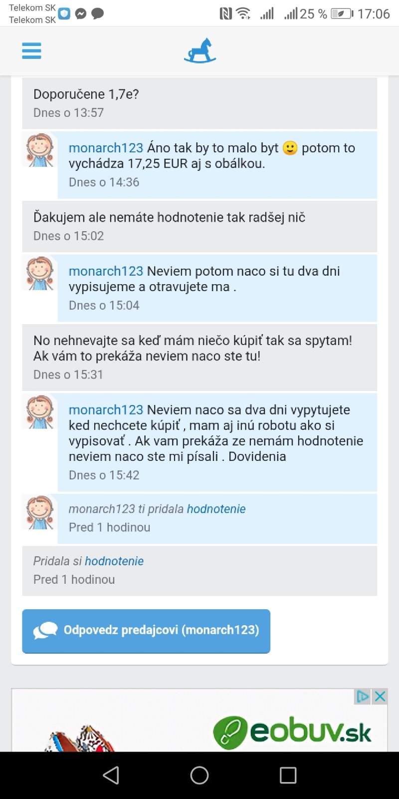 Z nie kompletnej konverzácia vyplýva ze som ochotne a promtne reagovala na všetky dotazy , doplnila informácie , doplnila fotografie podla požiadaviek pani , strávila s tým dva dni , pani nakoniec nekúpila len z dôvodu chýbajúcich hodnotení co bolo evidentne z môjho profilu od začiatku , nemala v úmysle kúpiť , len ma zavádzala , a strácala môj čas . Je to spekulantka , neodporúčam.
