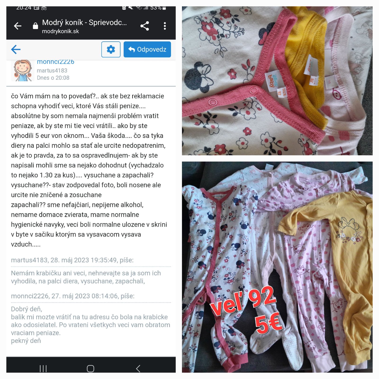 prikladam foto co pani kupila a našu naslednu komunikaciu.... k 4 overalom za 5 eur bolo v baliku este dievcenske tricko a kratasky v rovnakej velkosti, ktore som pribalila s dobrym umyslom ze niekomu este posluzia.... navyše som pytala postovne 1.40 aj ked balik presiahol 500g a postovne bolo 2.20 (rozdiel som nepytala zase s dobrym umyslom...)