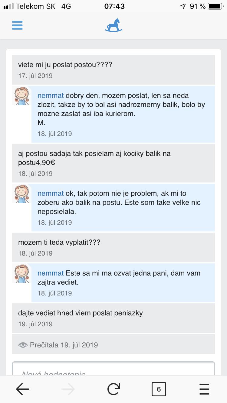Úžasný prístup predávajúcej, na všetkom sme sa rýchlo dohodli, všetko bolo bez problémov. Osobny odber prebehol príjemne a detské vecičky sú veľmi pekné. Ja som veľmi spokojná a predávajúcu môžem len odporúčať 🙂