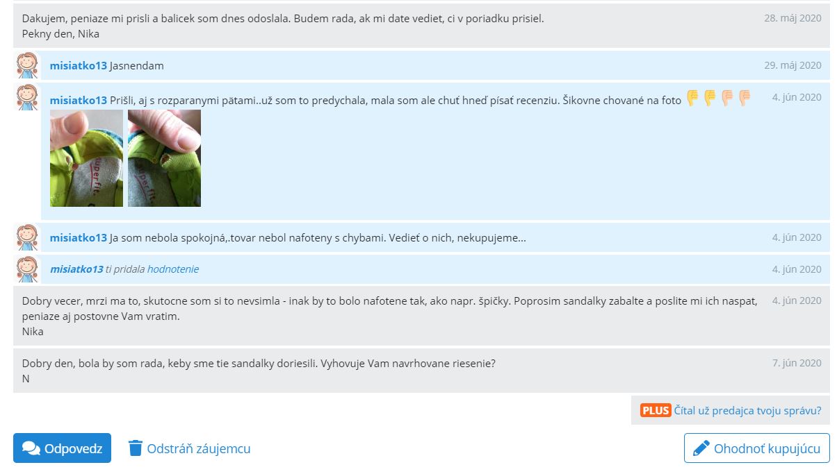 Mamicke som predavala sandalky, nafotene aj s chybami (napr. spica), nevsimla som si vsak na kusku roztrhnutu podsivku, takze na tuto vadu som neupozornila, ani ju neodfotila - uznavam a mrzi ma to. Kupujuca mamicka mi poslala spravu a hned na to aj hodnotenie. Este v ten vecer som sa jej ospravedlnila, chybu uznala a navrhla riesenie, aby mi sandale poslala spat, peniaze aj postovne jej vratim. Odvtedy sa mi vsak neozvala, takze zial, nemam tuto neprijemnu situaciu ako riesit.