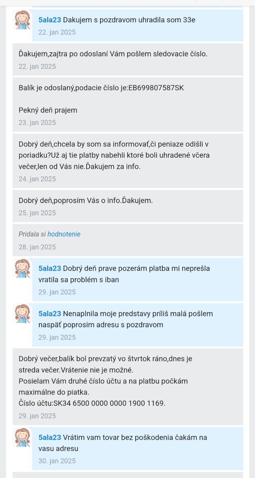 Opätovne vás žiadam o vašu adresu na vrátenia kabelky zn.joop za 28€, čo už som opakovane deklarovala v našej komunikacii v modrom koniku avšak z vašej strany vyšla iniciatíva a prostredníctvom administrátora ste zmazali našu úplnú komunikáciu a zostala na stránke modrý koník len polovičná komunikácia bez vašich vyhrážok ako som povinná ju uhradiť aj keď som vás opakovane žiadala o vašu adresu na vrátenie uvedenej kabelky. Pre vašu zaujímavosť celú komunikáciu mám uloženú.