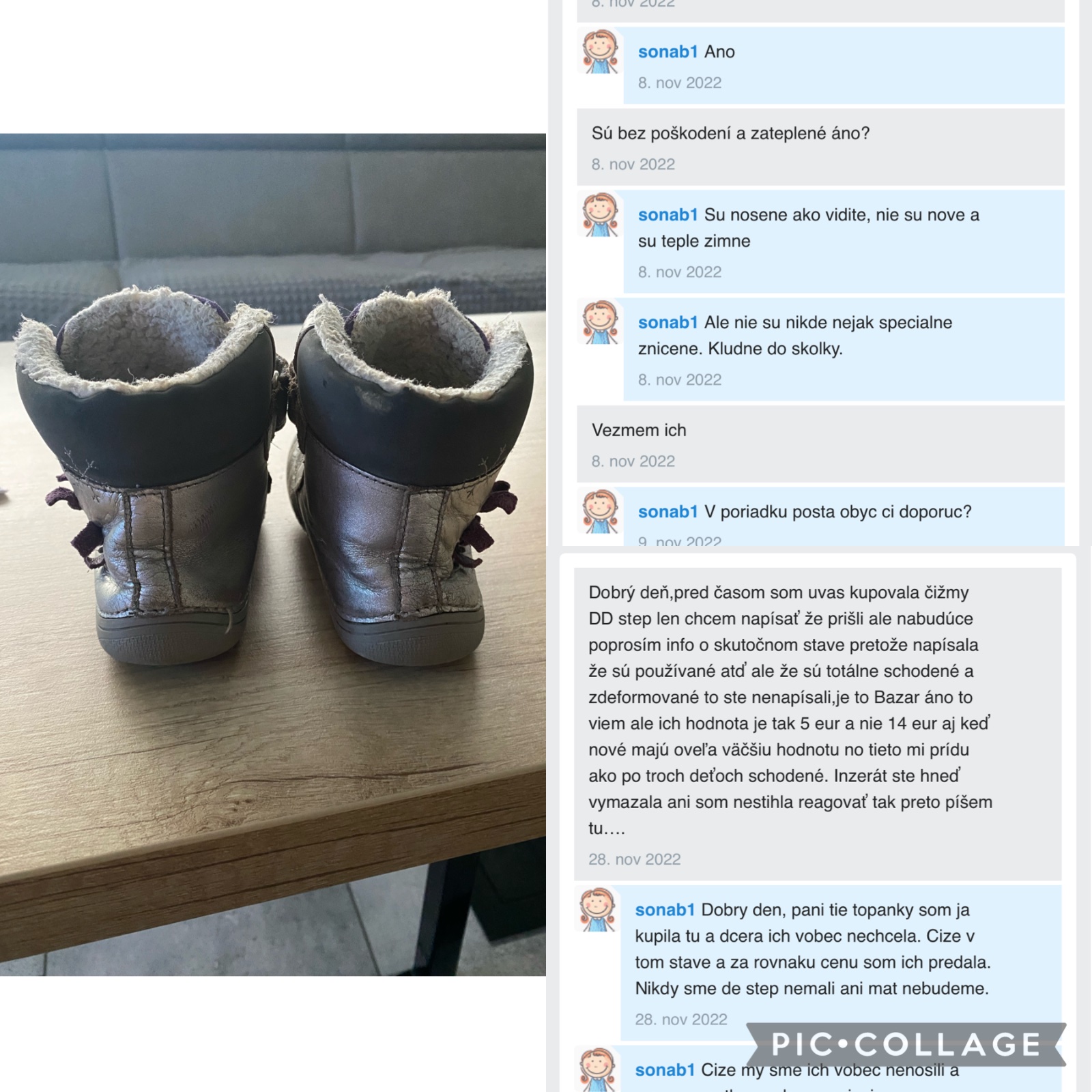 Mamičku neodporúčam nakoľko som nebola oboznámená so skutočným stavom topánok(viď.foto a správy na foto). Áno viem je to bazár ale také schodené topánky mi tu na MK ešte nikdy nikto nepredal!Dala som za ne peniaze a môžem ich rovno vyhodiť do koša pretože mi tak akurát zdeformujú dcérinu nohu a nič viac! Škrabance a ošúchana koža je bežná vec ale takto schodené a vykrivené to by som ani ďalej nepredávala. Odozvu na správu som dostala ako vidíte že oni ich ani nenosili a bla bla bla,ďakujem ale nikdy viac! Chcete len zarobiť peniaze,rýchlo predať ale ľudskosť nikde.Memohla by som v noci spať keby som také topánky predala,hanbila by som sa. Ďakujem!!!!