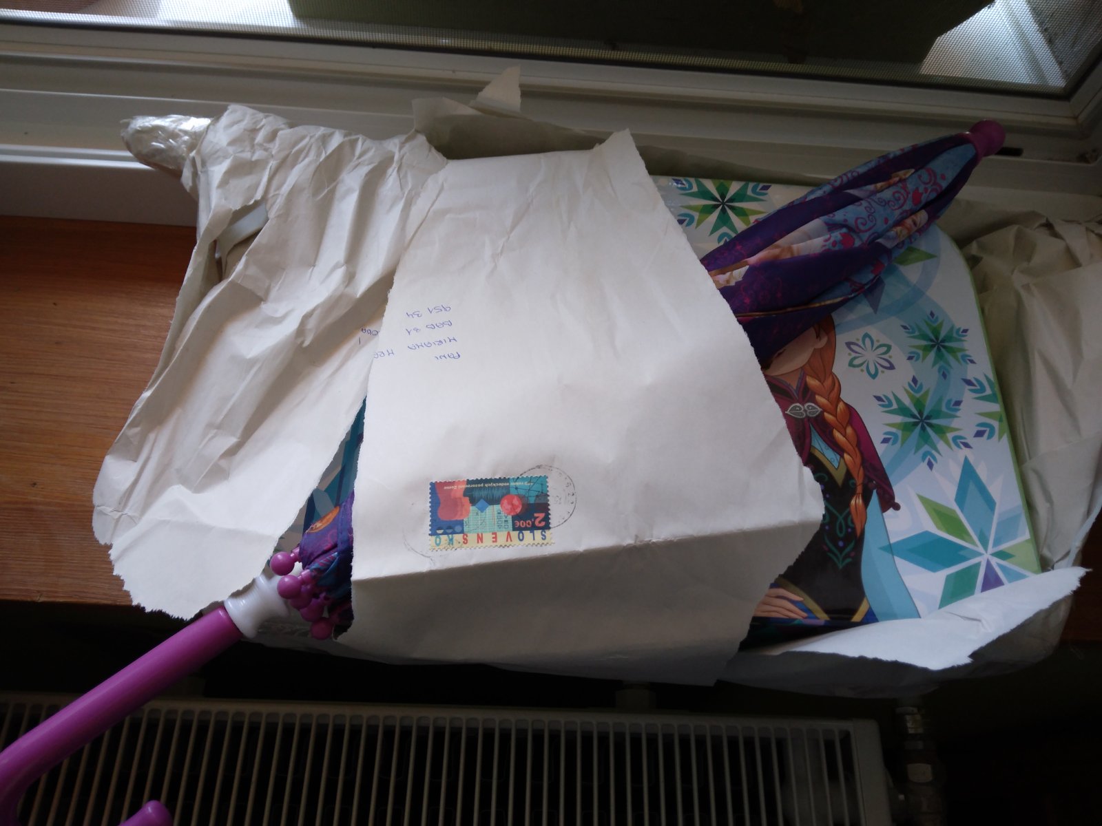 Balík roztrhany zabalenýv papieri poštárka to priniesla cele došklbane.