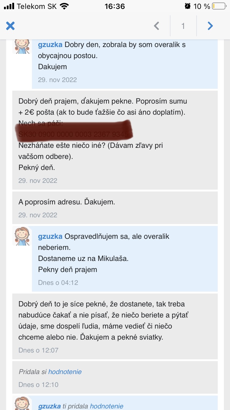 Toto je arogantné?🙈Keby každý takto zodpovedne pristupoval k predajom/nákupom koľko času to druhej strane zaberie zbytočne?Riadím sa pravidlami bazára, keď prejavím záujem a potom to o pár dní zruším dostanem také hodnotenie aj ja, (+stoja ďalší, čo mali záujem) napísala som pravdu, nič zlé (že ste obchod zrušila, a ešte som dodala ako plus že aspoň ste sa ozvala 🙈) Naopak Vaše hodnotenie je len odozva urazenej osoby a hlavne proti pravidlám..ozaj správanie “dospelej” osoby. Pekné sviatky.