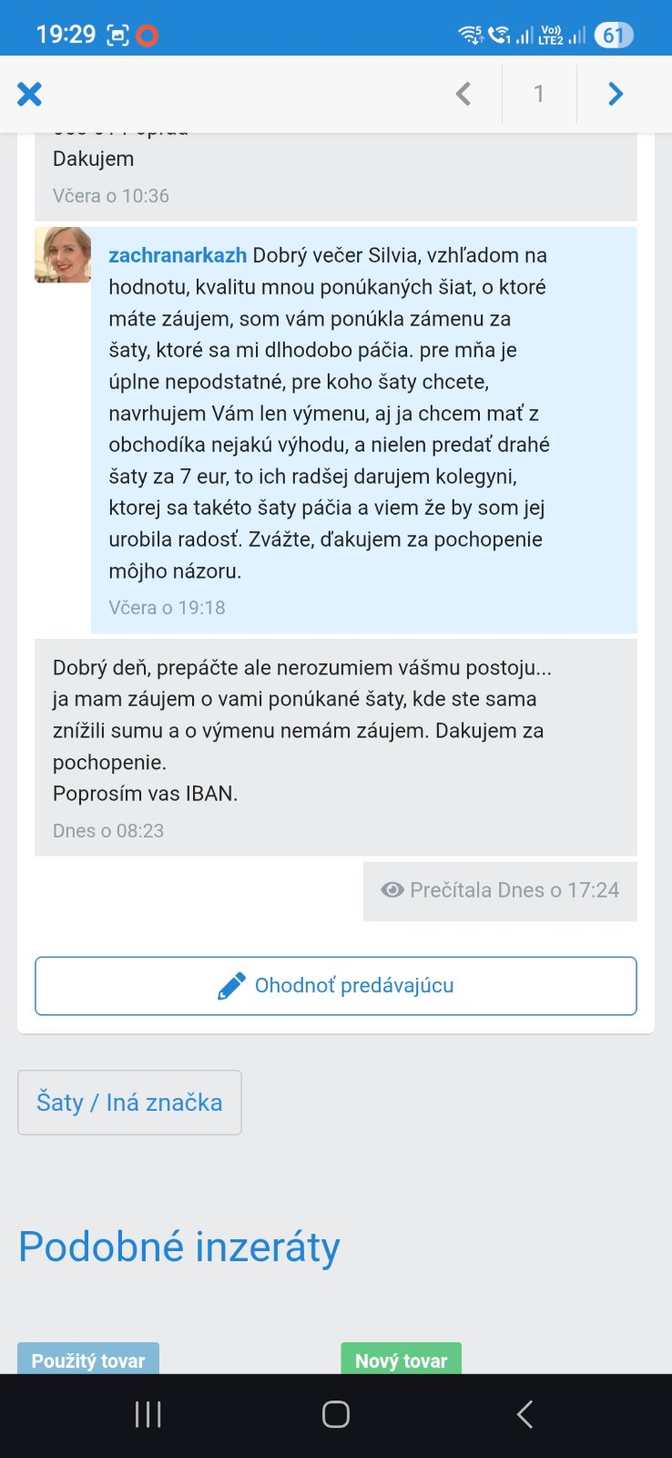 Kto je tu nekorektný ste Vy, navrhla som vám výmenu za menej hodnotné šaty, ktoré sa mi dlho páčili a keďže ste odmietla, informovala som vás, že šaty radšej darujem, čo aj urobím😊ale nie Vám, ale mojej milej kolegyni. Spôsob Vašej komunikácie sa mi vôbec nepáčil, moje rozhodnutie. A ešte poznámočka: šaty mali byť nakoniec údajne pre Vašu svokru, ktorú si podľa môjho názoru veľmi málo vážite, nakoľko výmenou (za nič) ste mohla mať pre ňu krásne šaty, namiesto toto píšete takéto komentáre. Tiež Vás NEODPORÚČAM !