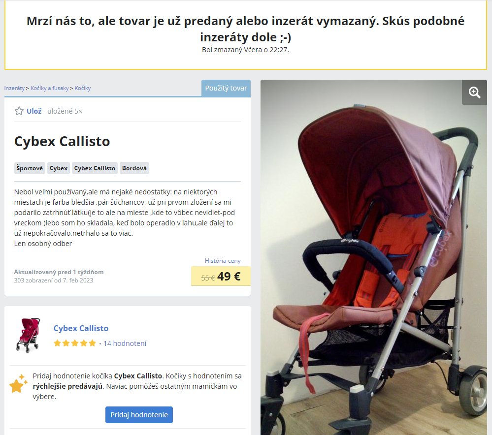 Kočík nezodpovedal stavu v popise inzerátu. Kolesá sa zasekavaju, látka taktiež vyzerá opotrebovane. Za mňa sklamanie, kupovala som mačku vo vreci.