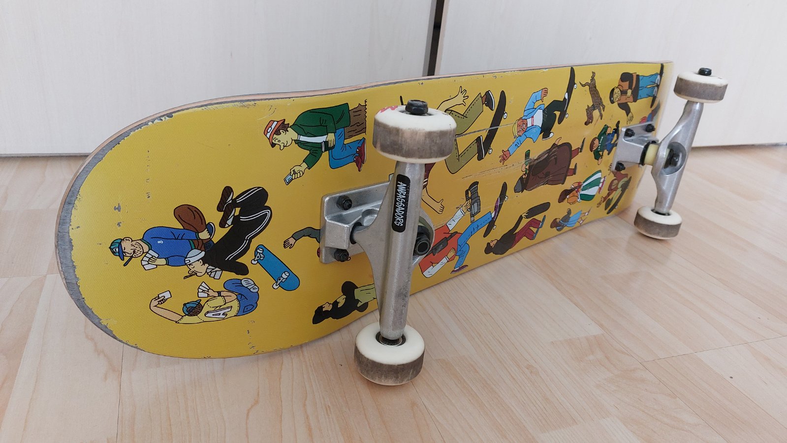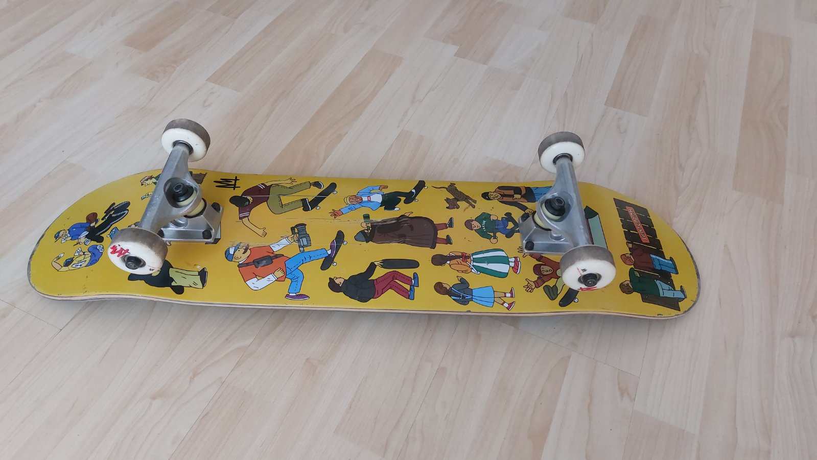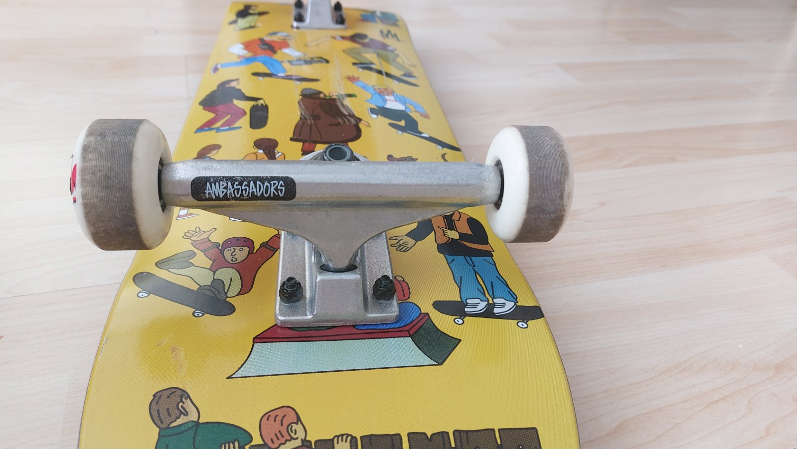 Málo používaný, na pár tréningov, krásna doska, stav veľmi dobrý až výborný, pár ošuchov na spodu, viď foto. Šírka dosky je 7.875 High s konkávnym tvarom, rozmery sú na fotke. Skateboard je značky Ambassador, kupovaný v skate shope.