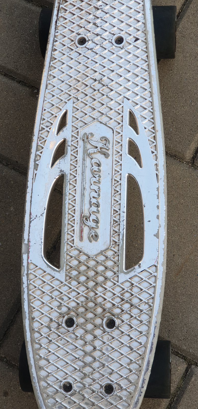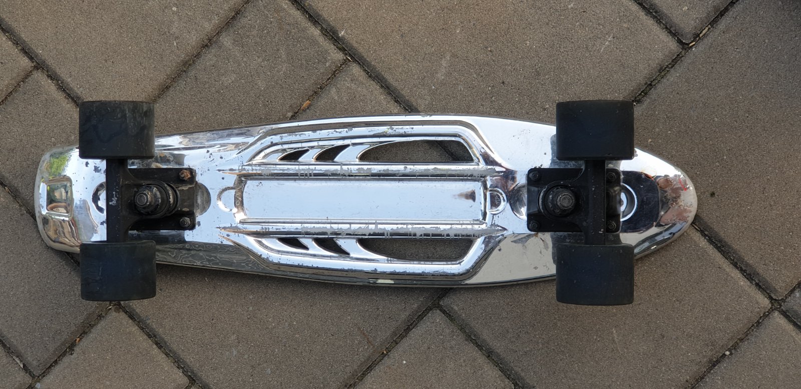Na predaj penny board pre deti/mládež,po používaní oškretá strieborná farba, funkčné kolieska.