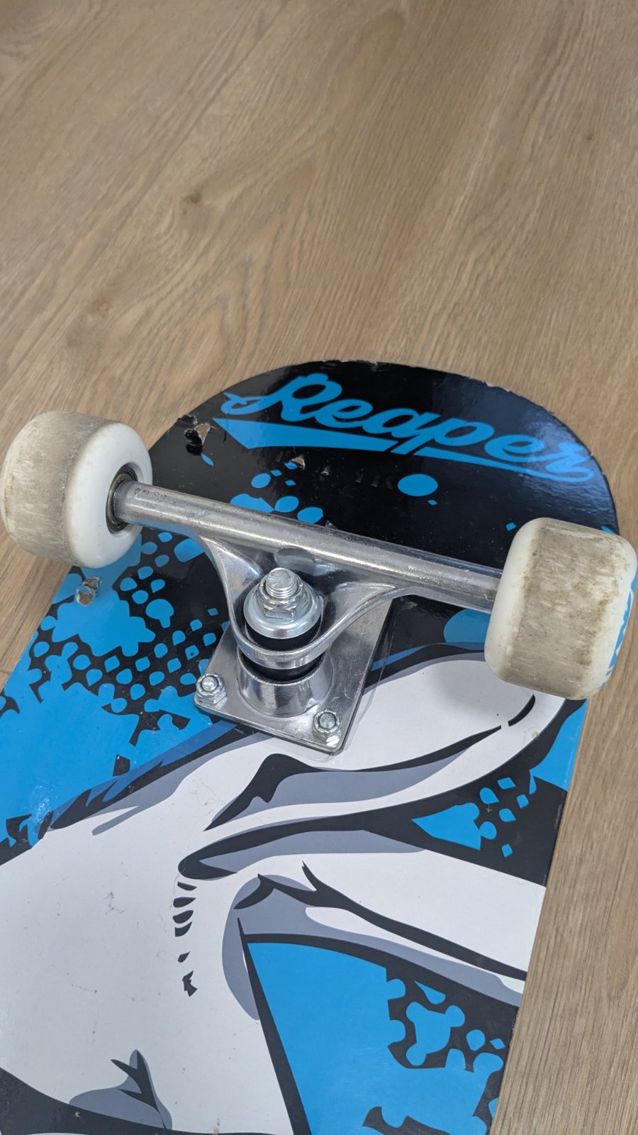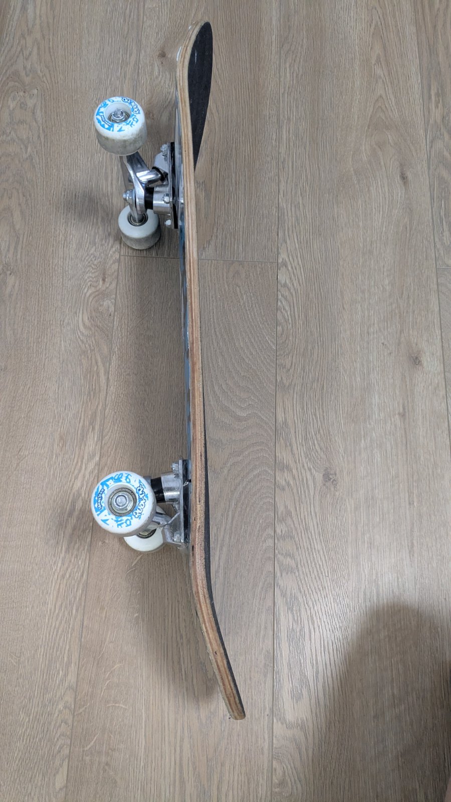 Juniorský, vhodný pre začiatočnikov, tvar Double kick flat, hliníkové trucky, základný striekaný grip, 9 vrstiev čínskeho javora, trucky 5'' alu, koliesko 50x36 mm, 95A, dĺžka 71 cm, šírka 20 cm, nosnosť max 50kg. V dobrom stave, mierne škrabance, ale doska neposkodená.