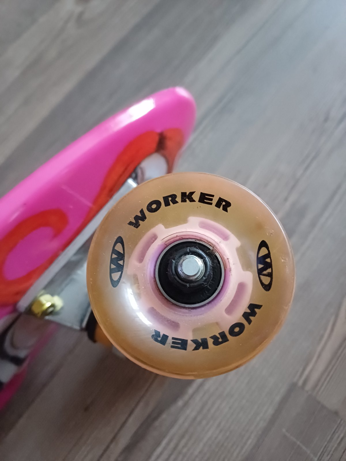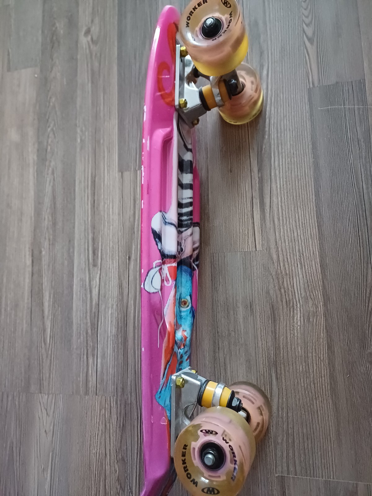 Krásny dievčenský peniboard je používaný, má sito ružovú farbu dosky a kolieska su žlté.