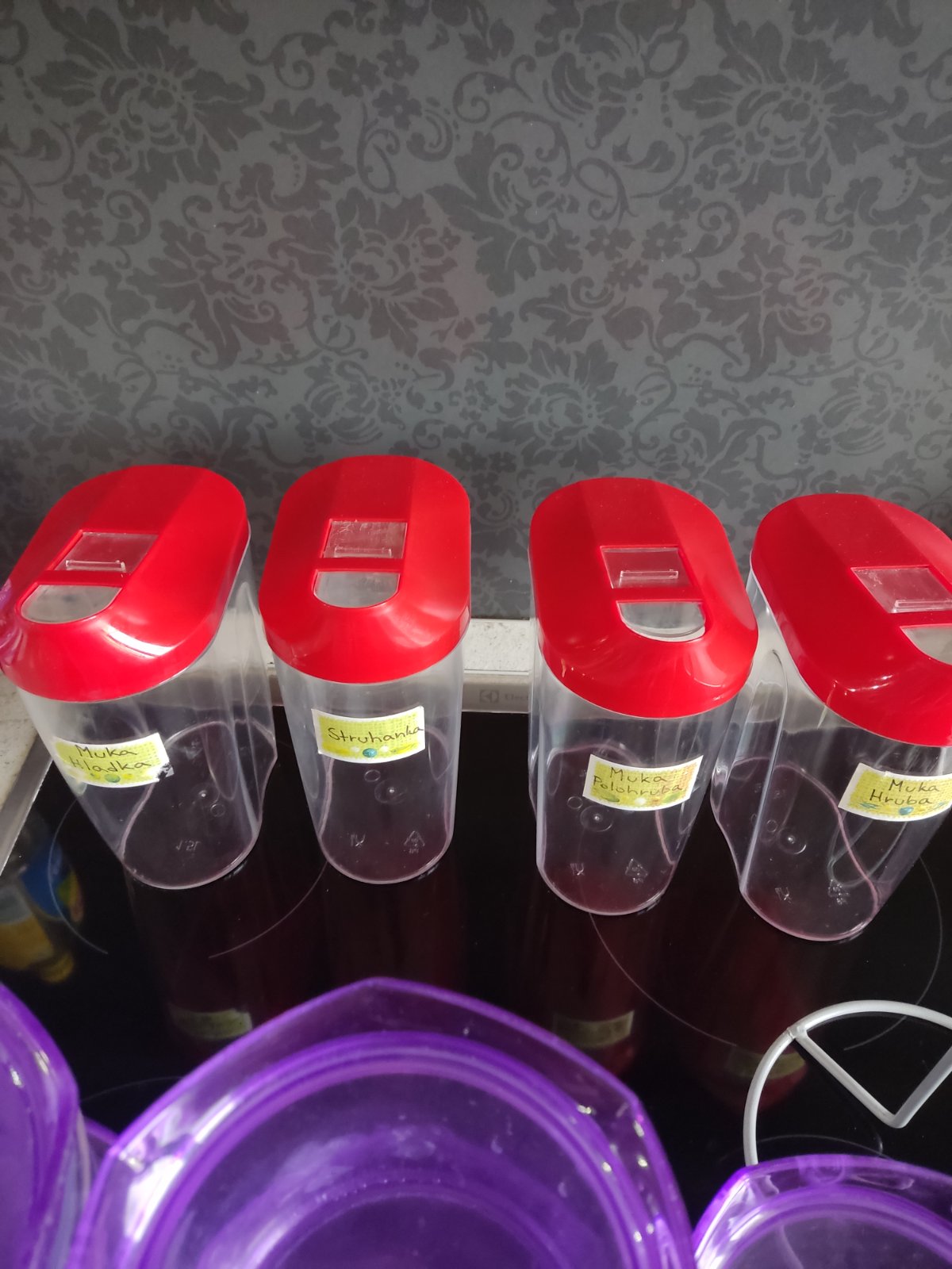 Predám dózy plastové na muku väčšie červené 1ks 1,50eur,a malé 1euro fialové plus stojan na rolku papierovu na papier 2, 40eur