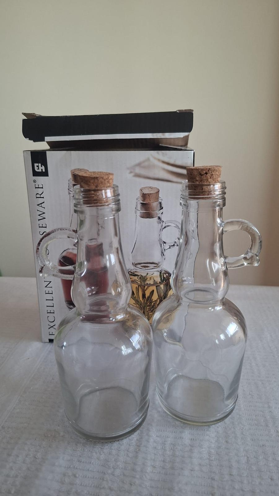 Predám sadu dvoch sklenených fľaštičiek na dochucovanie jedál (olej, ocot, domáce dresingy). Majú uško a korkovú zátku pre zachovanie arómy. Výška 18 cm, objem 250ml. Čisté, nepoškodené, pôvodne balené v krabici.