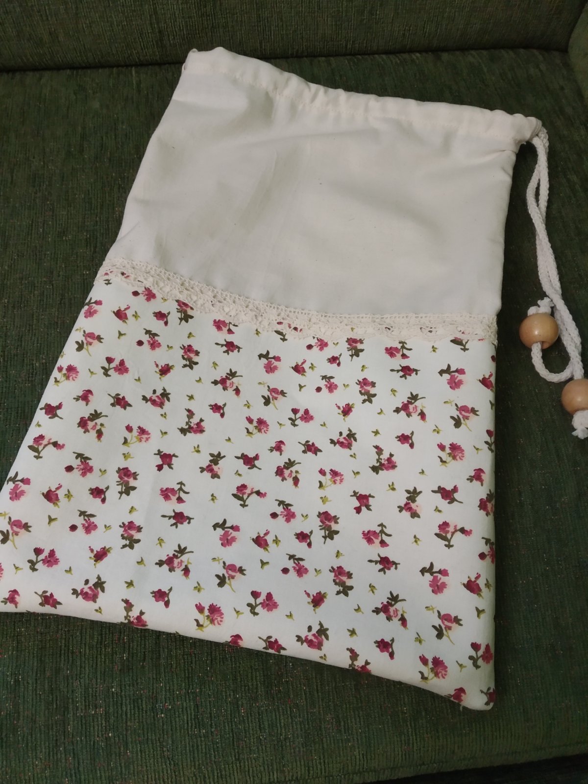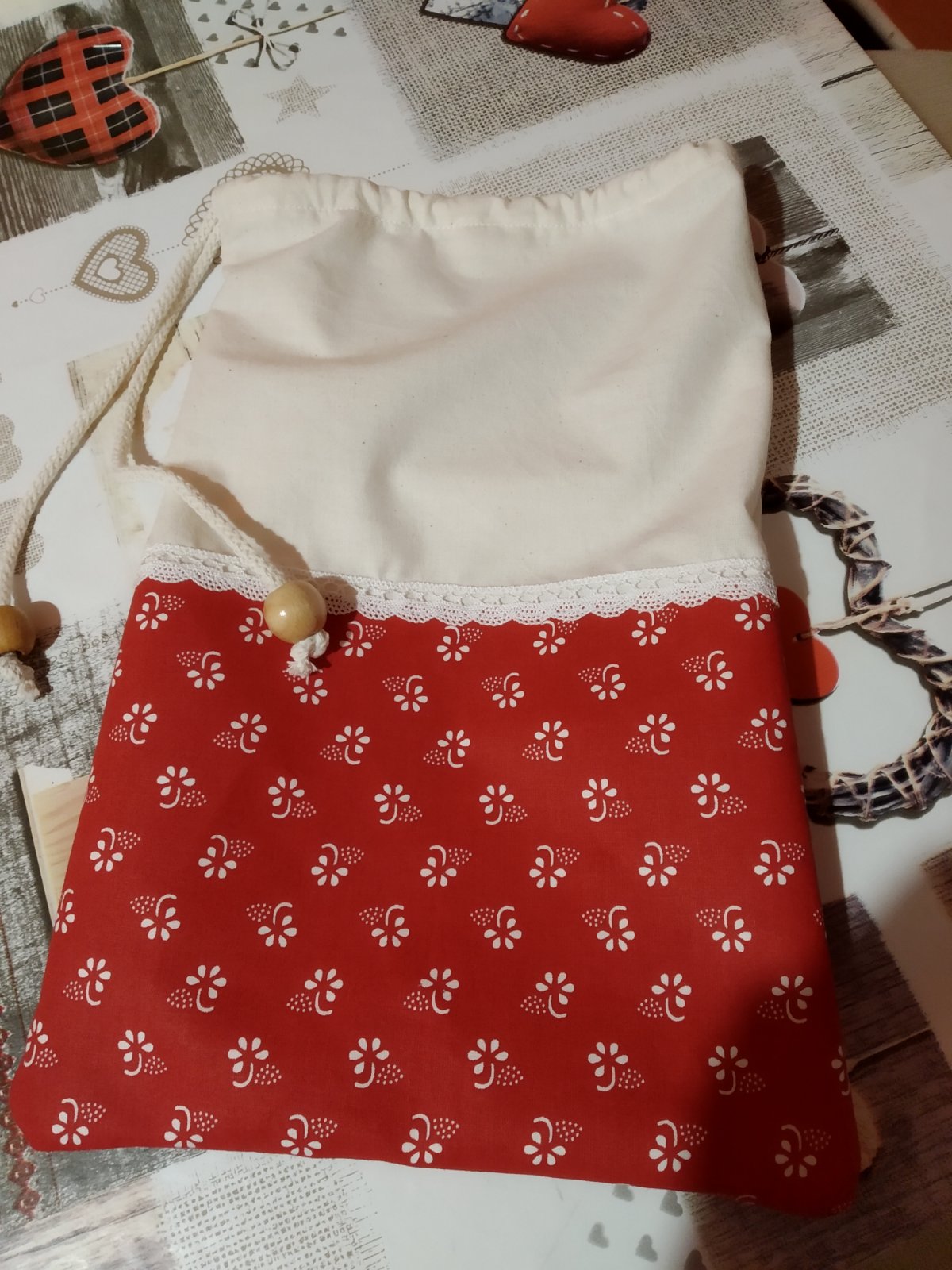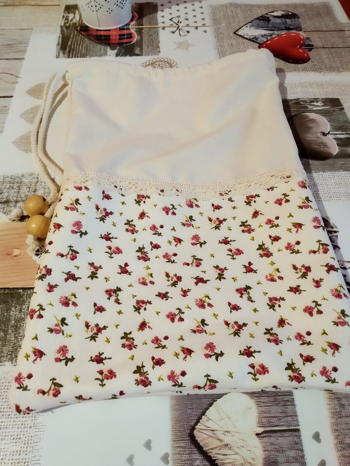 Krásne bavlnené vrecko na chlieb či pečivo.. na stiahnutie a zaviazané.. možnosť prať na 40 stupňoch spodná polovica je vystužená vlizelinom..doplnený čipkou