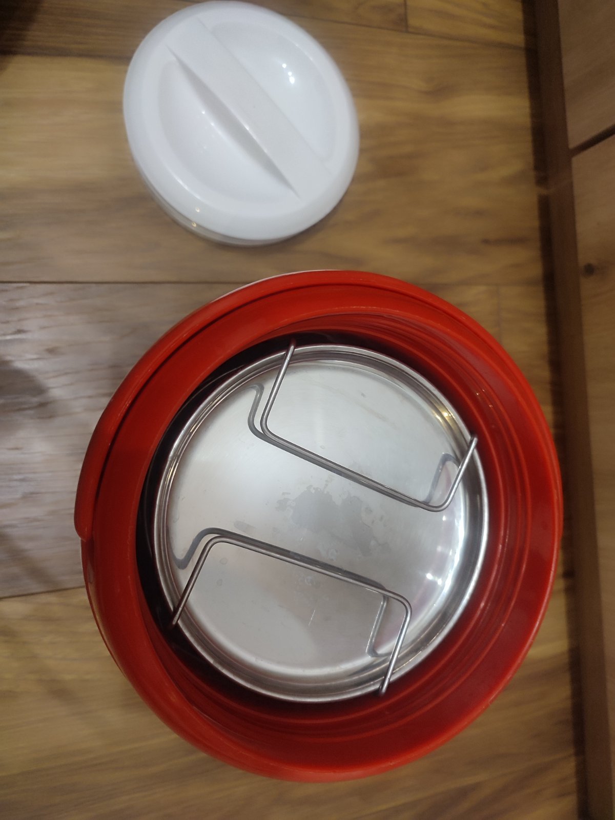 Ponúkam používaný obedár / jedlonosič. Obsahuje tri nerezové nádoby na jedlo, ktoré sa vkladajú do plastového termoobalu. Každá nádoba na jedlo má vlastný tesniaci nerezový vrchnák. Termoobal má tesniaci vrchnák na obdržanie obsahu v teplom a bezpečnom stave a rúčku na prenášanie a jedlo v ňom si dlho drží svoju teplotu. Objem každej nerezovej nádoby je 0,7l. Obedár bol používaný, ale aj napriek tomu je vo výbornom stave, nemá žiadne stopy po užívaní.
