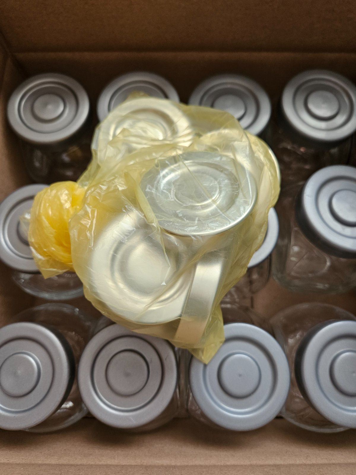 18ks. Sklenené nádoby so striebornými viečkami na korenie alebo cukor