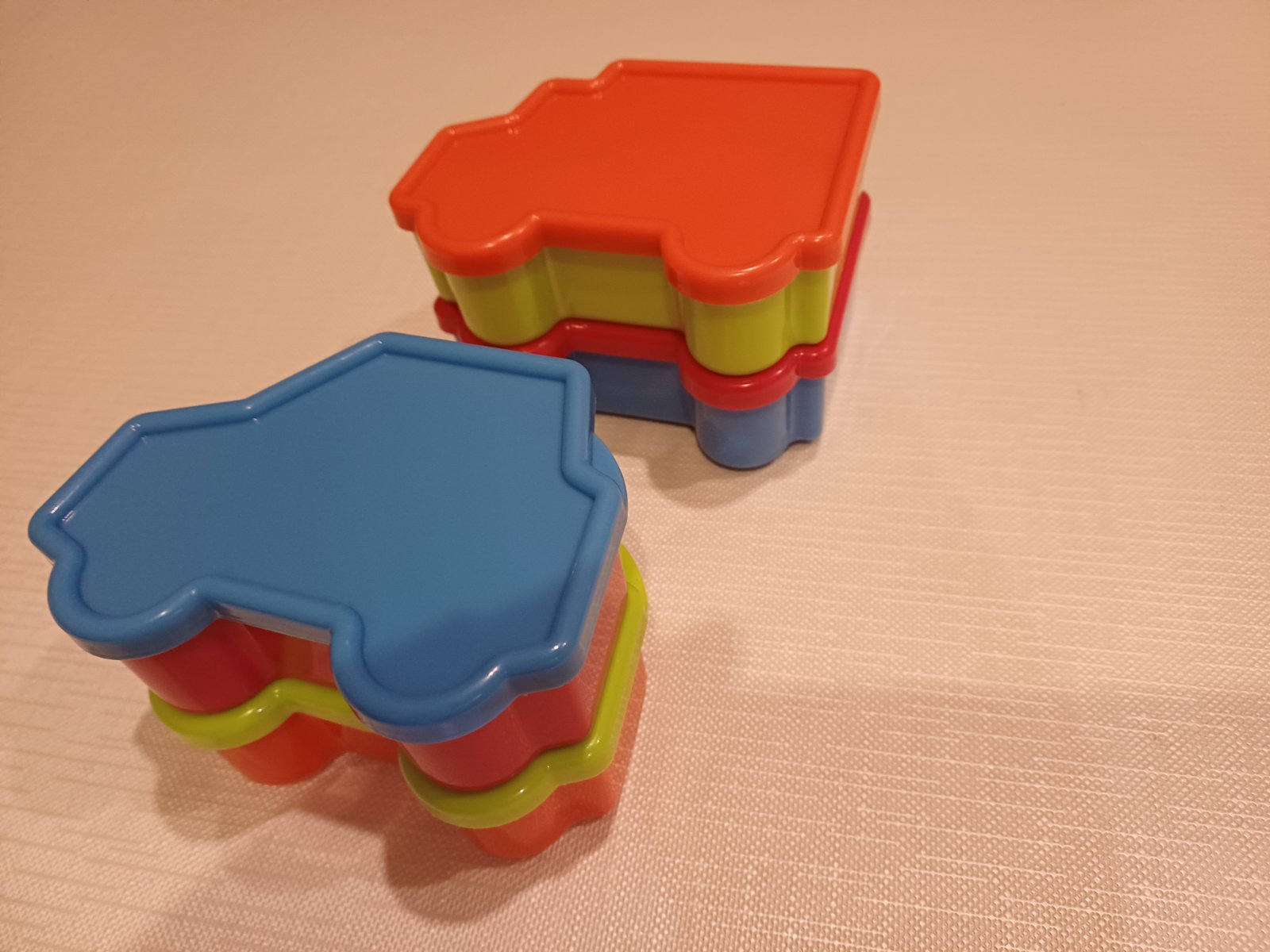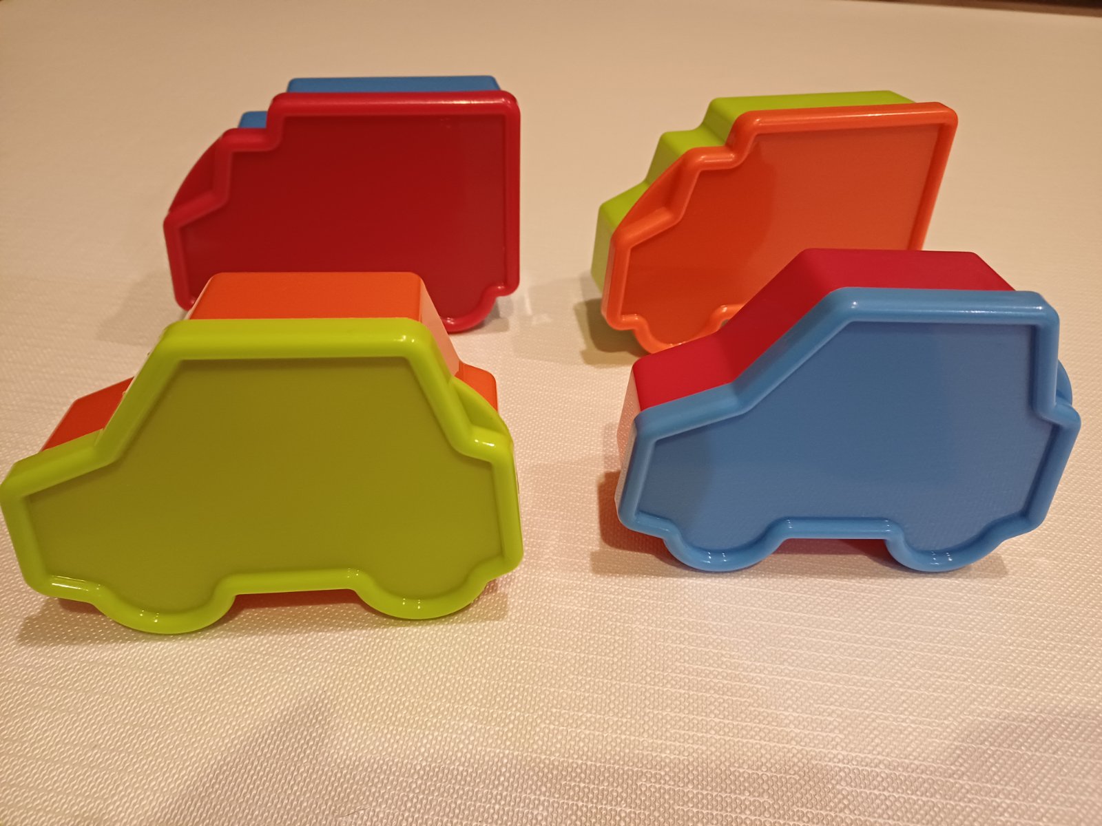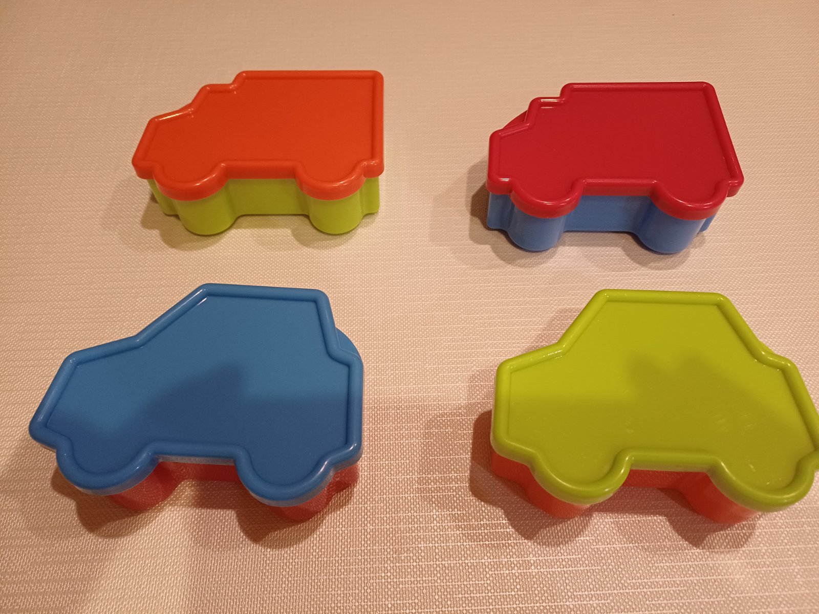 Predám farebné krabičky na drobný snack pre deti (sušienky, ovocie,...) v tvare áut kúpené v Tchibo. Kvalitný plast, sú vhodné do umývačky riadu. Balenie 4 kusy.