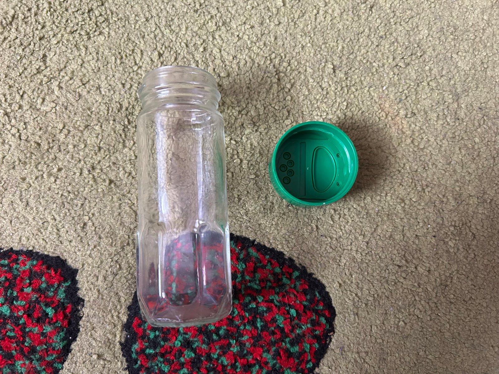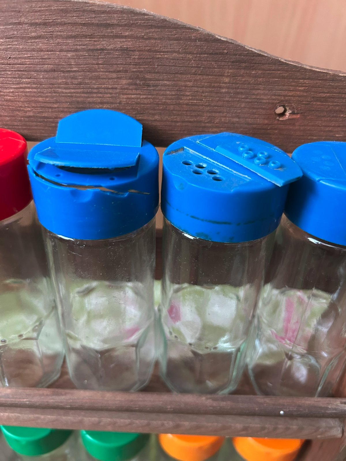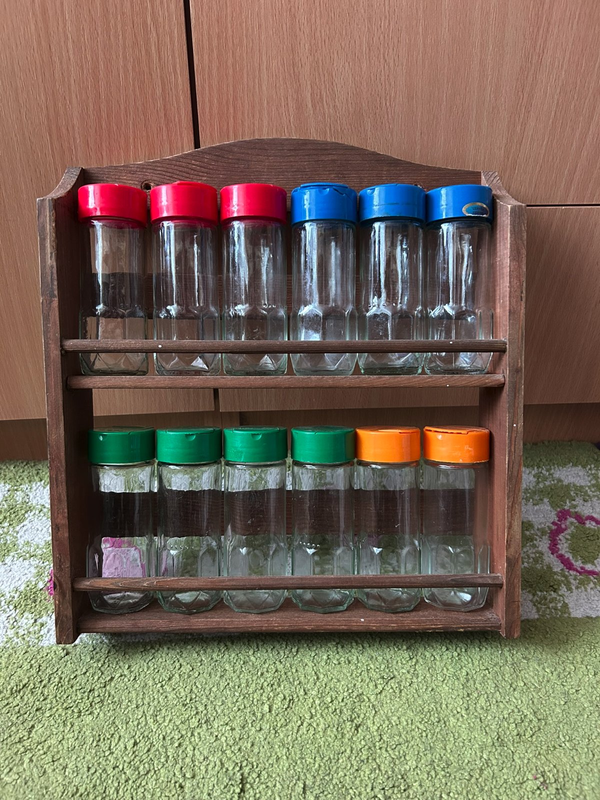 drevená závesná polička so sklenenými koreničkami - 12 ks