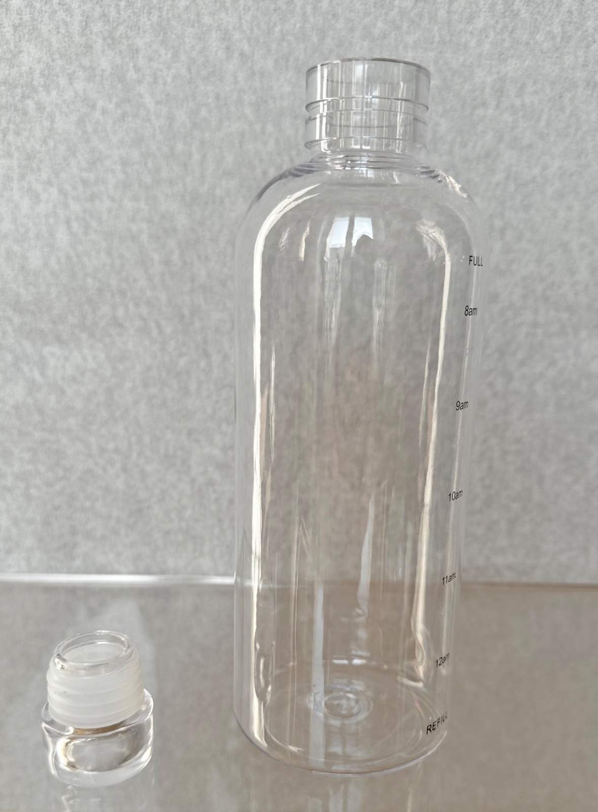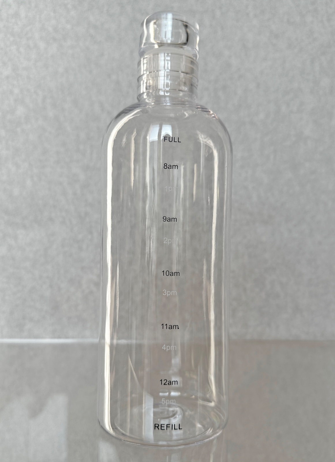 Praktická fľaša na vodu s časovou riskou pre kontrolu pitného režimu od 8 hod rána do 5 hod popoludní.