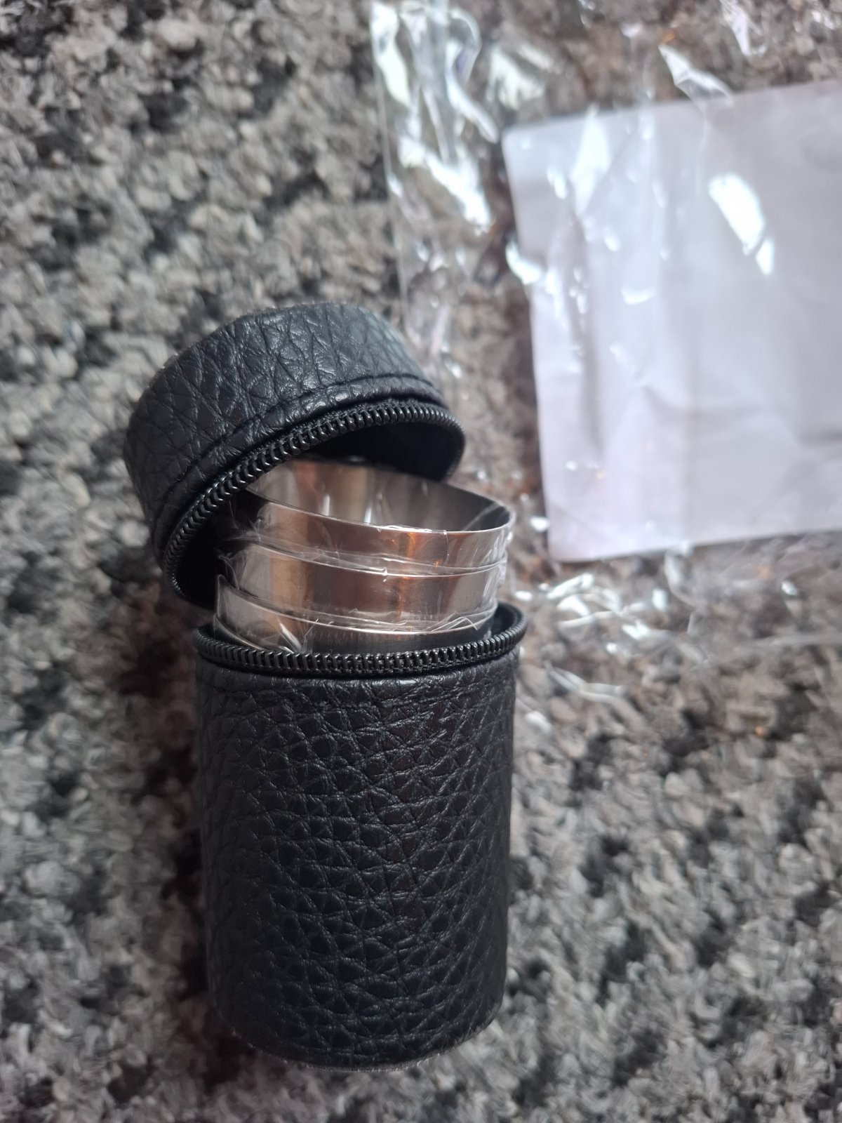 Sada nerezových pohárikov v koženkovom púzdre